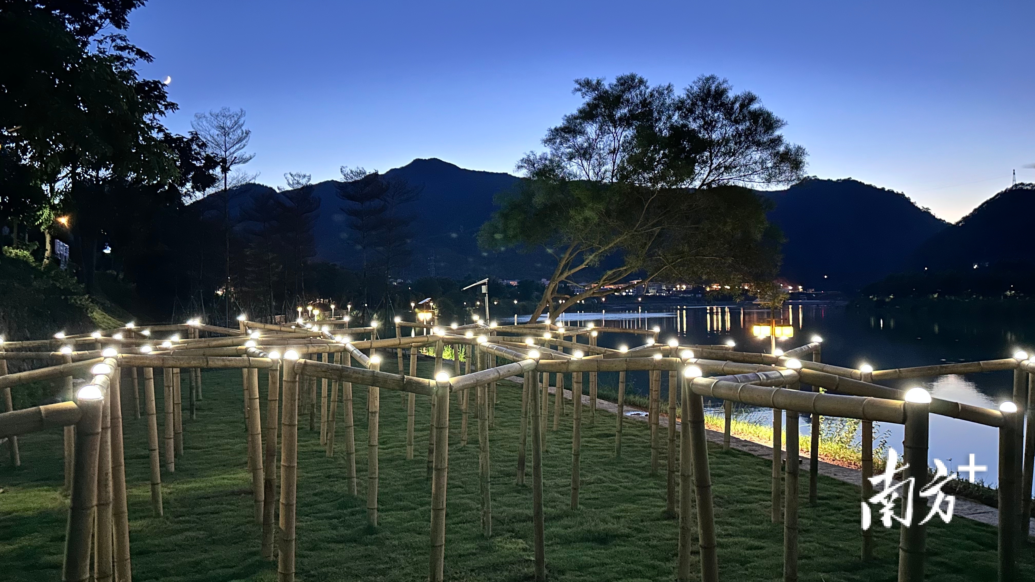 仙境般的水畔,交错的竹节骨架,宛如蜂巢,又像河流蜿蜒在地表的自然形态,映射蕉岭的竹林绿意与水系肌理;到了夜里,嵌入竹节的柔和灯点渐次亮起,似栖落的星辰竹节,明灭闪烁间赋予乡土一种静谧而温暖的归属感。