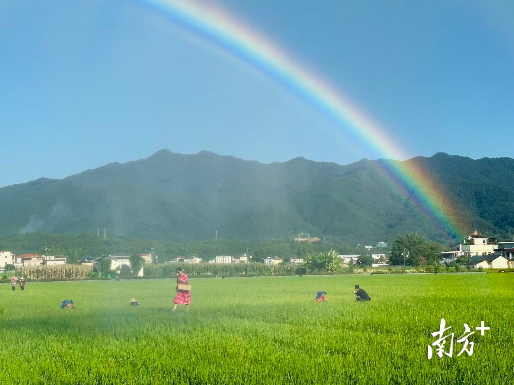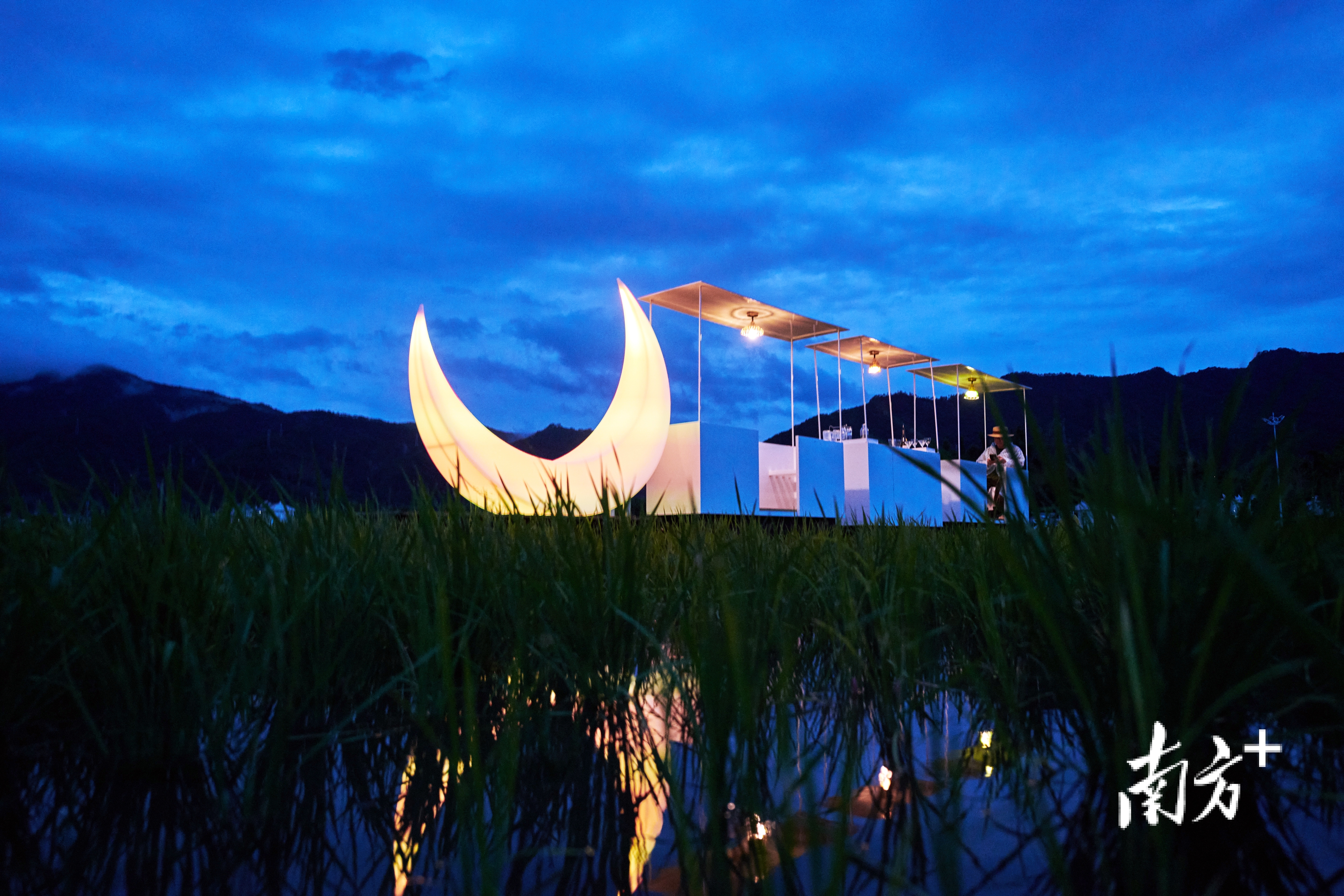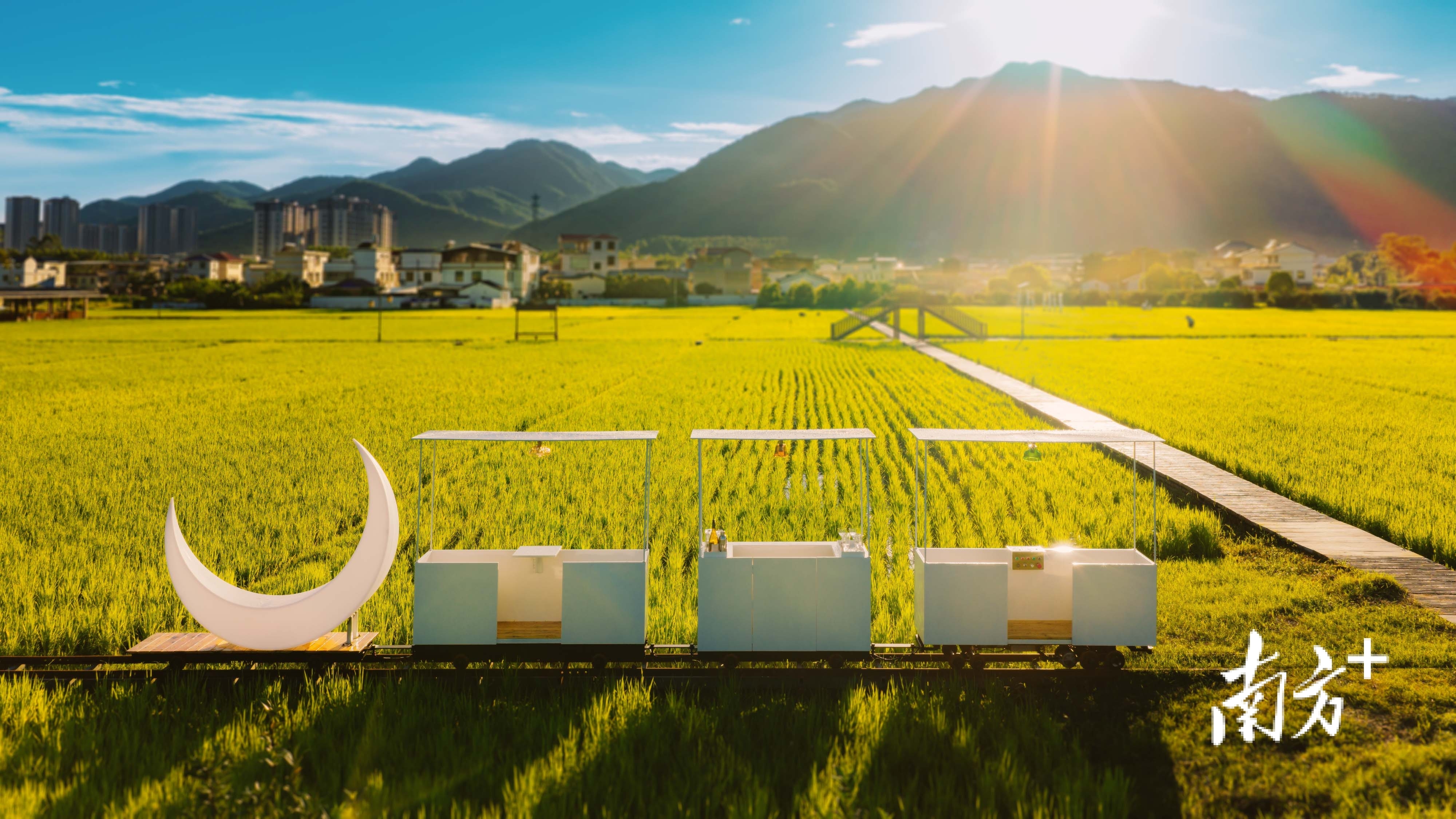 《光栖竹境》的灵感线索蜂巢和竹子,都是蕉岭当地的特产;艺术家陈文令用蕉岭的溪石,搭起了4.5米高的作品《平衡之巅》,顶部的小红人顶着镜球,倒映蓝天白云和大地肌理;艺术家刁勇的作品《稻田里的移动酒吧》,充分利用白马广场原有的火车轨道,月牙小火车装置穿行稻浪,人们在车上喝着小酒微醺,晚风拂面,乡村生活瞬间浪漫起来;艺术家杨千用科技手段,人工在稻田上“升”起了一道彩虹,让美好触手可及……
