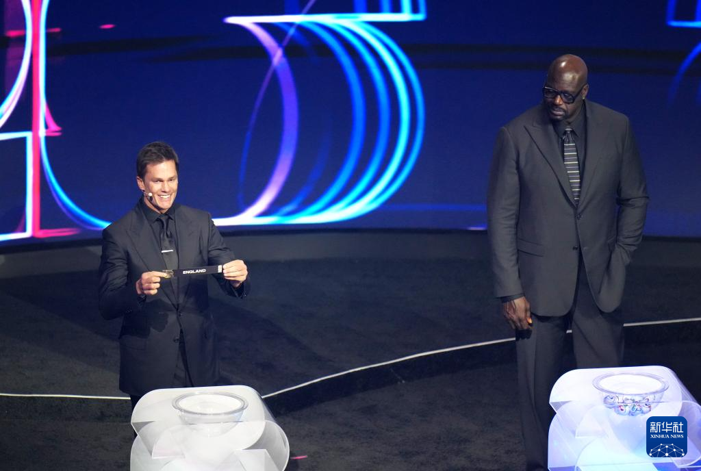 12月5日,抽签嘉宾汤姆·布拉迪(左)展示写有英格兰队的签条。