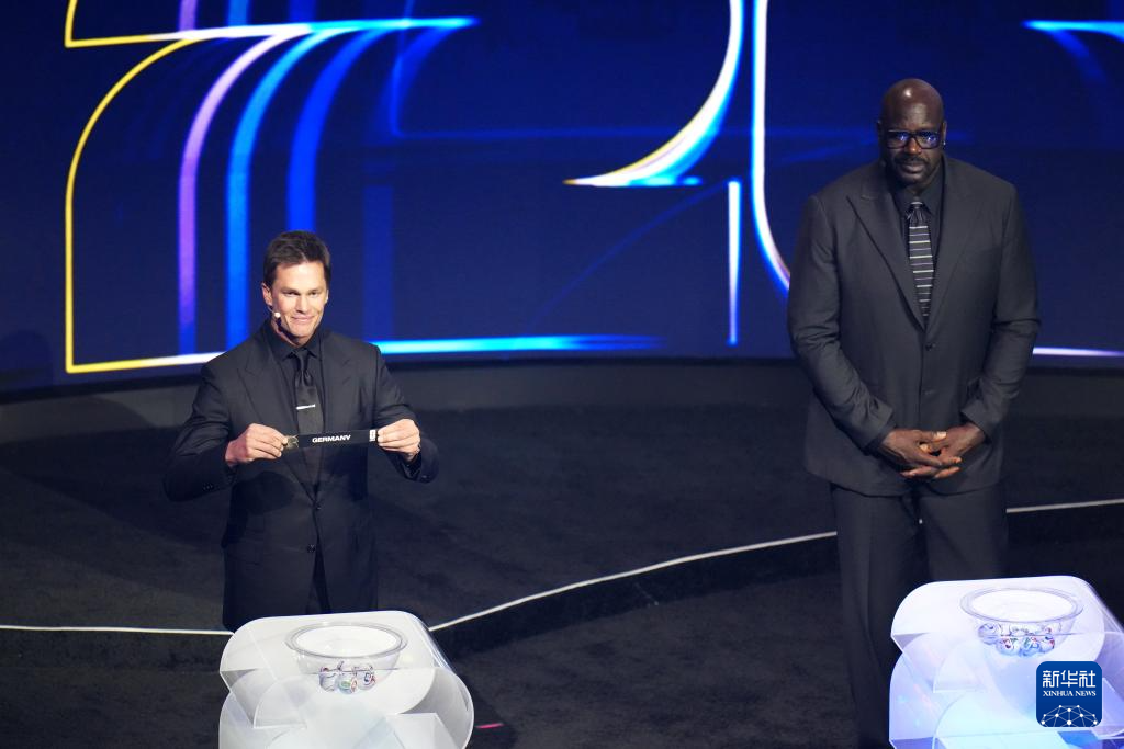 12月5日,抽签嘉宾汤姆·布拉迪(左)展示写有德国队的签条。