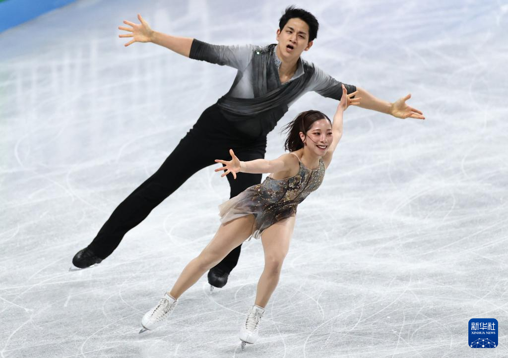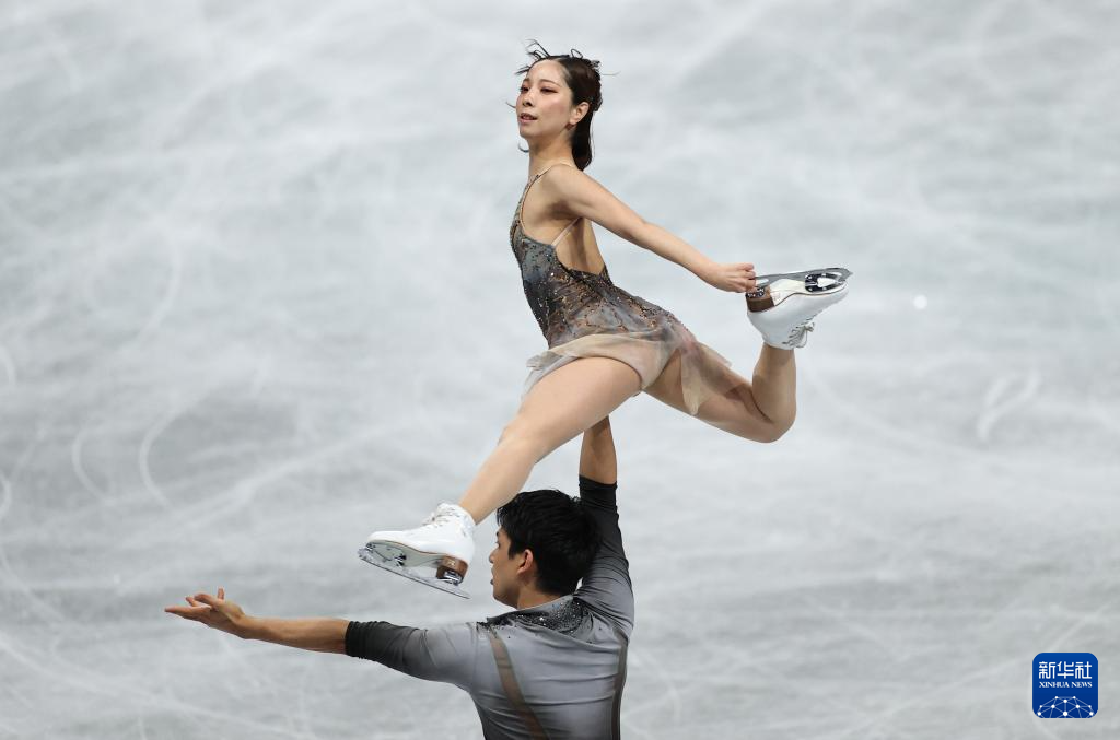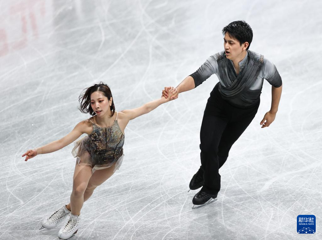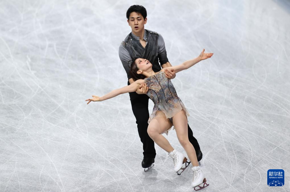 12月5日,日本组合三浦璃来(左)/木原龙一在双人滑自由滑比赛中。最终,他们以225.21分的成绩夺得双人滑金牌。