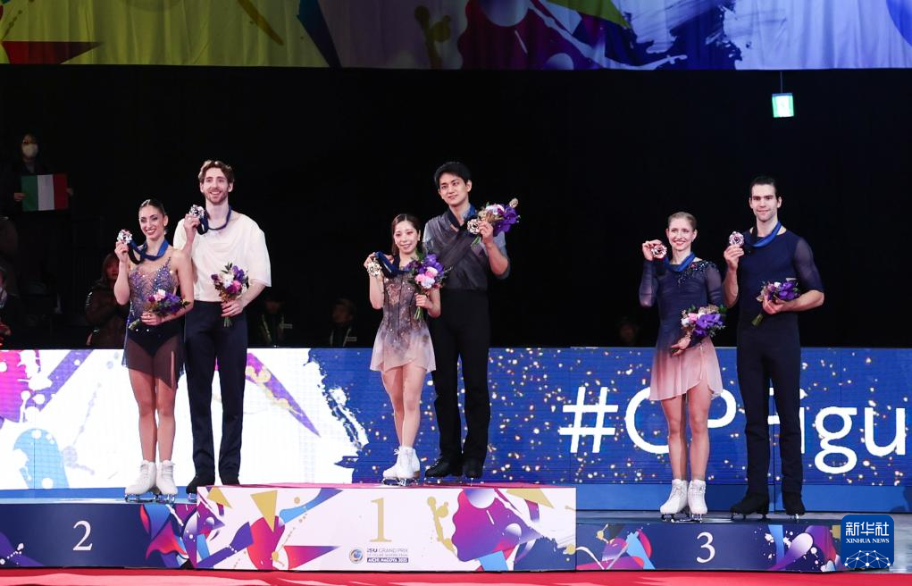 12月5日,冠军日本组合三浦璃来(左三)/木原龙一(右三)、亚军意大利组合孔蒂(左一)/马西(左二)与季军德国组合哈泽/沃洛丁(右一)在双人滑颁奖仪式中合影。