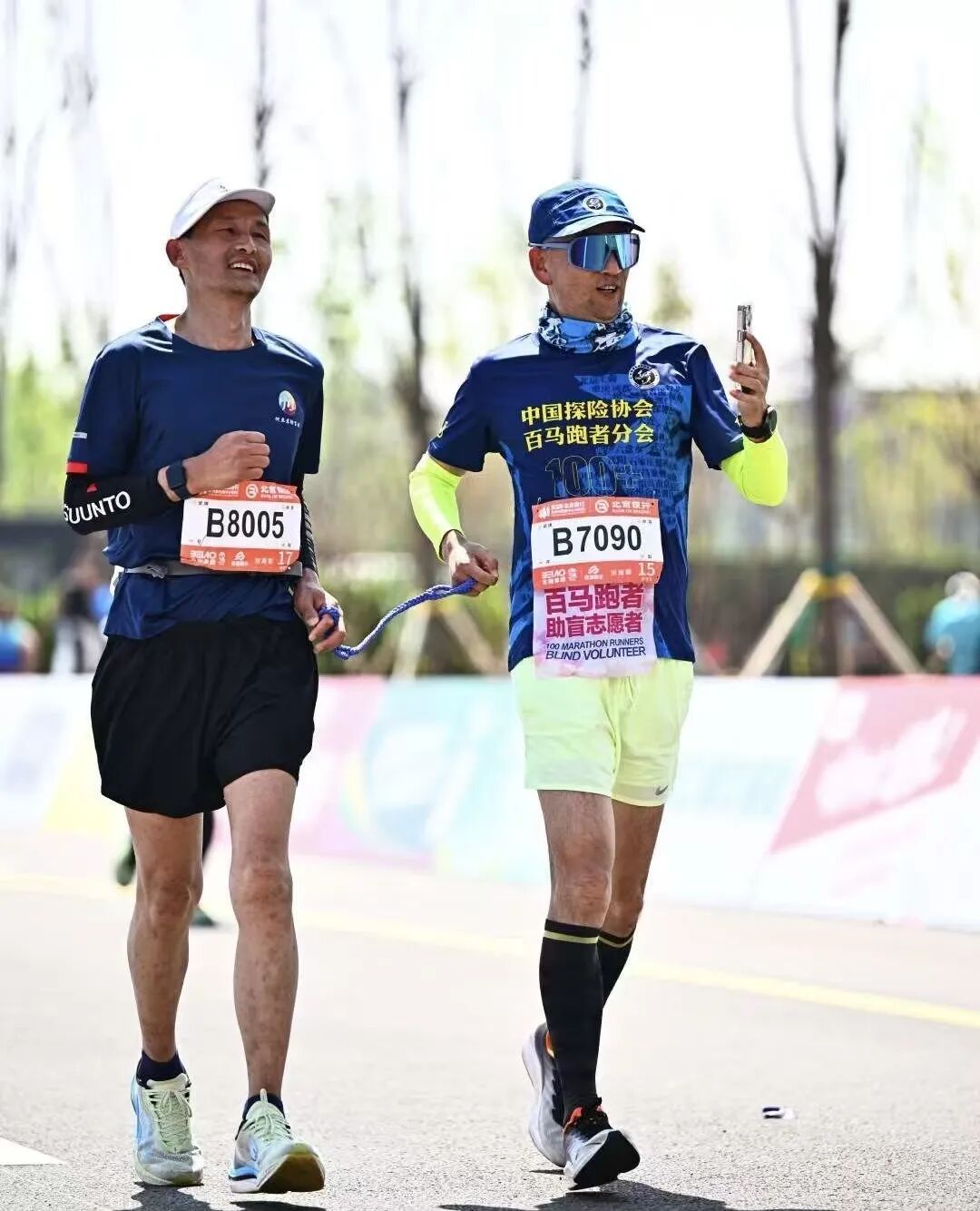 法国人米歇尔100多年前发明马拉松比赛时不会想到,一群看不清路的人跑进了赛道。只需要一根约30厘米的尼龙绳,两端都编上圆环,分别交给视障者和引跑志愿者,比赛就这么开始了。