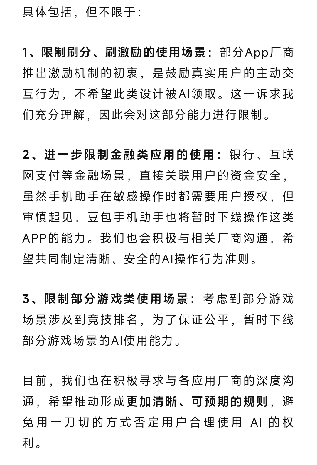 最近“用户认知一般,但是在行业内群情激昂”的“大事”,无疑是中兴旗下努比亚手机搭载豆包助手所引发的行业热议,围绕行业关心的问题,在12月5日,豆包手机助手对外发布《关于调整AI操作手机能力的说明》(以下简称《说明》),对近期行业内关注的限制刷分、刷激励的使用场景;进一步限制金融类应用的使用和限制部分游戏类使用场景三个问题做出了包括但不限于的规则化调整。