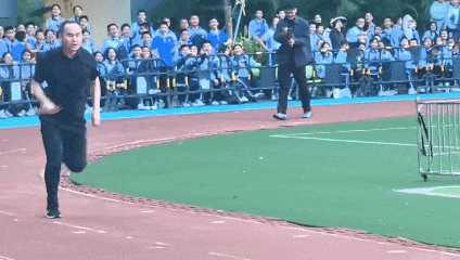 而体育老师则展现了专业的奔跑姿态