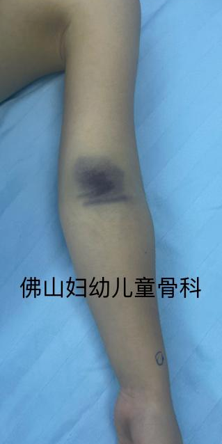 受伤体外照片:可见肘部肿胀、畸形、瘀血↓