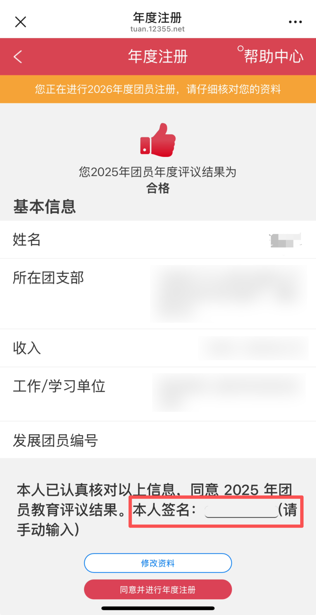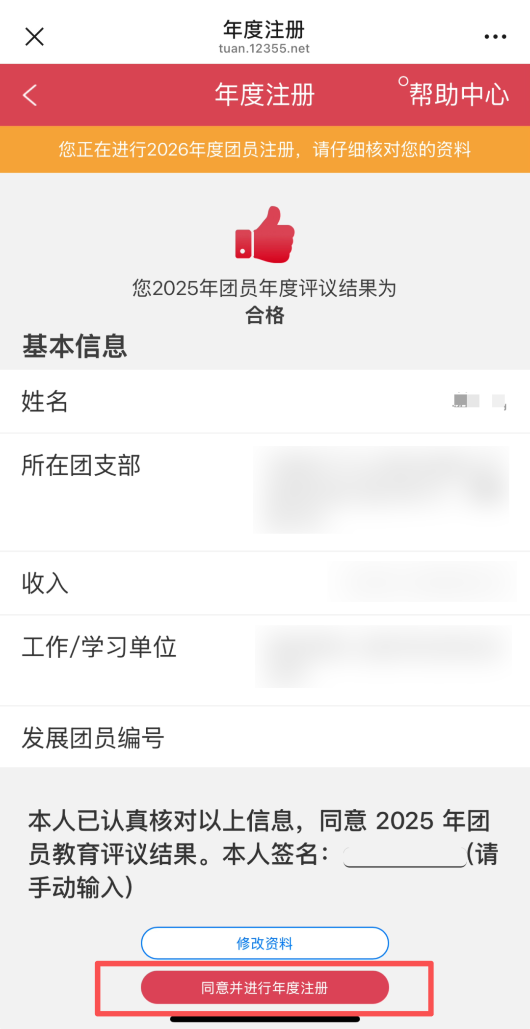 4、团组织代团员进行年度团籍注册时,提示“该团员收入不符合要求,请修改后再进行年度团籍注册”应该怎么办?