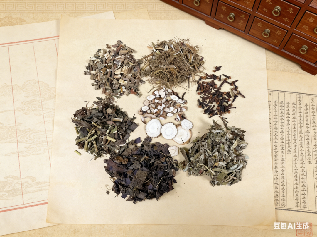 艾叶、丁香、紫苏、广藿香、佩兰、石菖蒲、青蒿、白芷各5克。