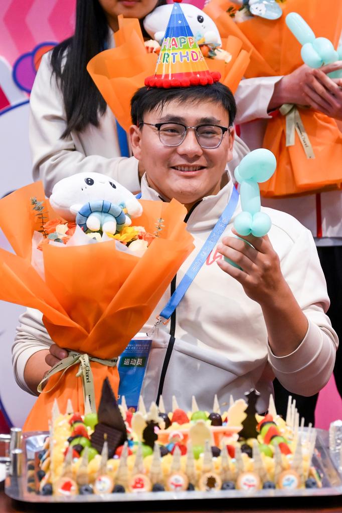 ↑12月10日,工作人员为河北队运动员周洪转(前)佩戴生日帽。新华社记者 陈浩明 摄