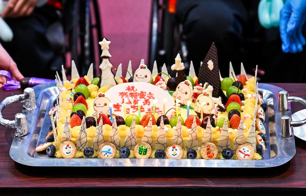 ↑12月10日在集体生日会活动现场拍摄的生日蛋糕。新华社记者 陈浩明 摄