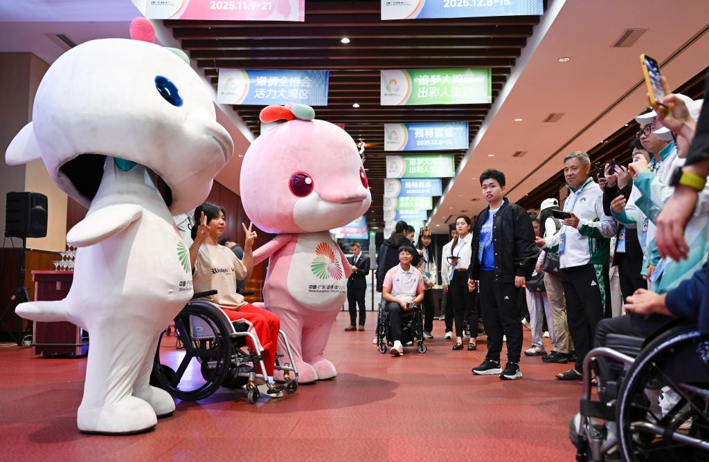 ↑12月10日,运动员在活动现场与吉祥物合影留念。新华社记者 陈浩明 摄