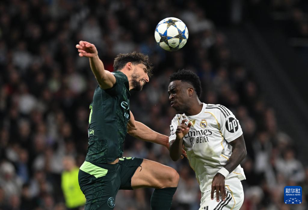 12月10日,皇家马德里队球员维尼修斯(右)在比赛中争顶。