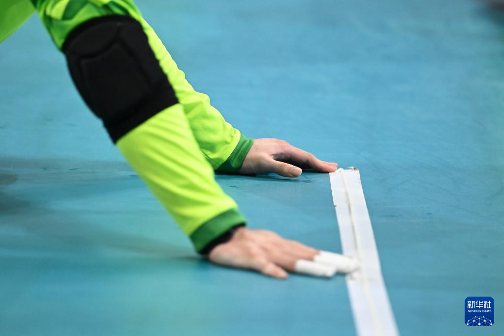 12月11日,上海队运动员胡晓挺在比赛中触摸球场线判断位置。