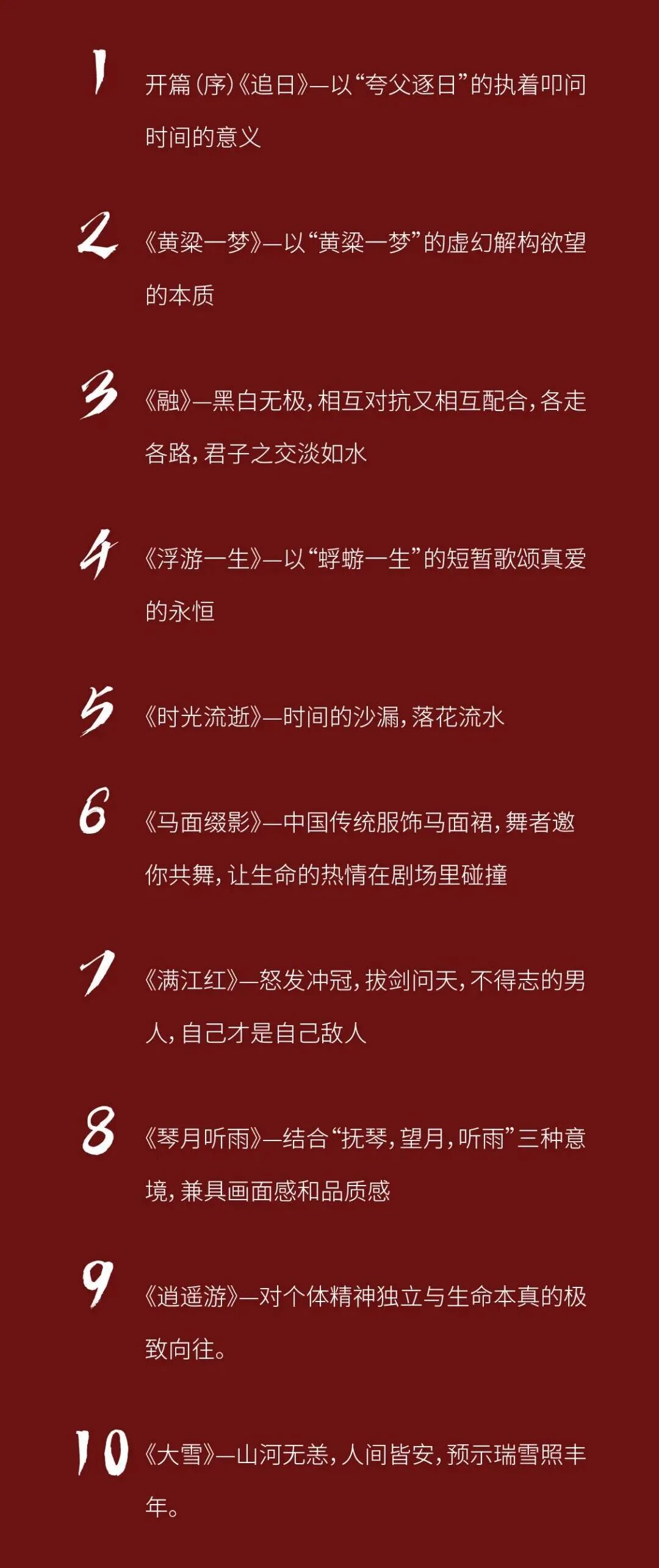 演出以经典历史典故为依托,用“夸父逐日叩问时间意义、“黄粱一梦”解构欲望本质、“蜉蝣一生”歌颂生命的意义;从岳飞“怒发冲冠”的剑影,到马面裙互动、从竹林七贤“逍遥游”对生活的向往、到大雪中“山河无恙”的安宁,融合传统古典舞与中国十大雅事之韵,传递年轻人对生命的思考、对时间的叩问及对美好生活的极致向往。该作品是公狗剧场诚意满满的转折之战。