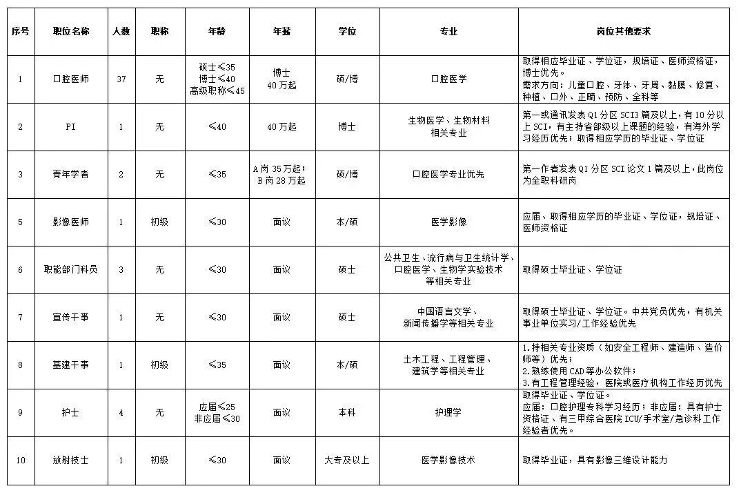 招聘时间:口腔医学博士长期招聘,其他岗位招满即止。
