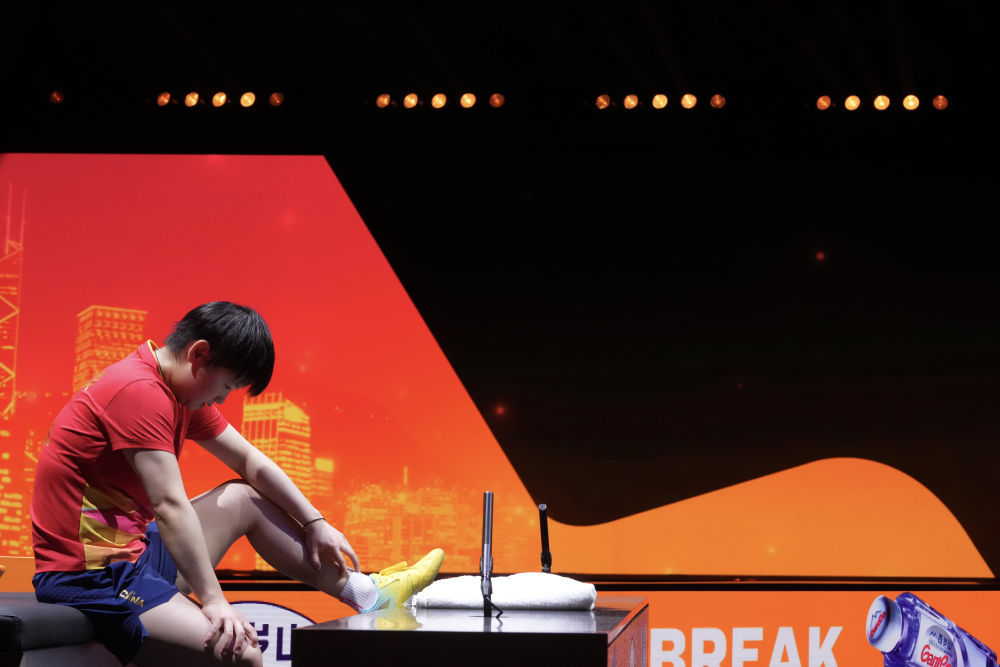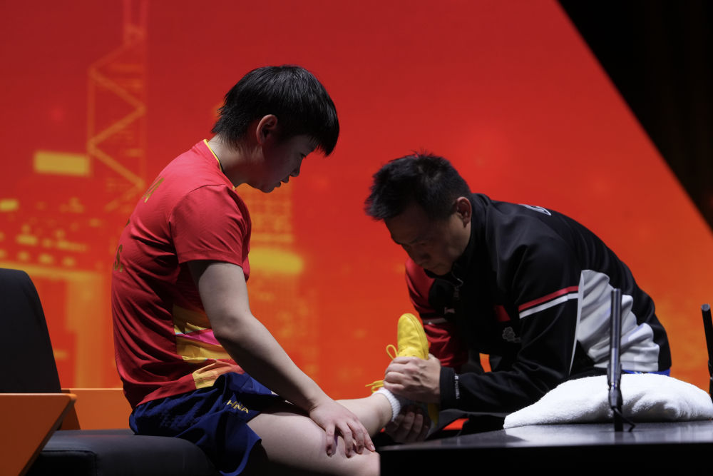 12月13日,在香港进行的2025年世界乒乓球职业大联盟(WTT)总决赛女子单打半决赛中,中国选手孙颖莎因伤退赛,蒯曼晋级决赛。图为孙颖莎在比赛中接受治疗。新华社发(吕小炜摄)