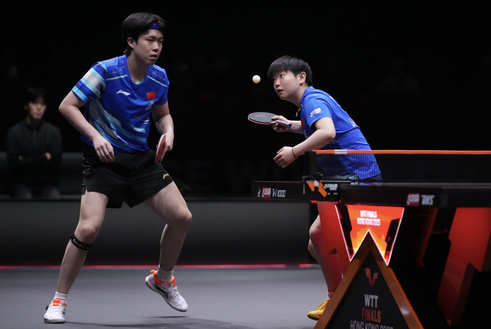 12月13日,在香港进行的2025年世界乒乓球职业大联盟(WTT)总决赛混双决赛中,中国组合王楚钦/孙颖莎0比3不敌韩国组合林仲勋/申裕斌,获得亚军。图为王楚钦(左)/孙颖莎在比赛中。新华社发(吕小炜摄)