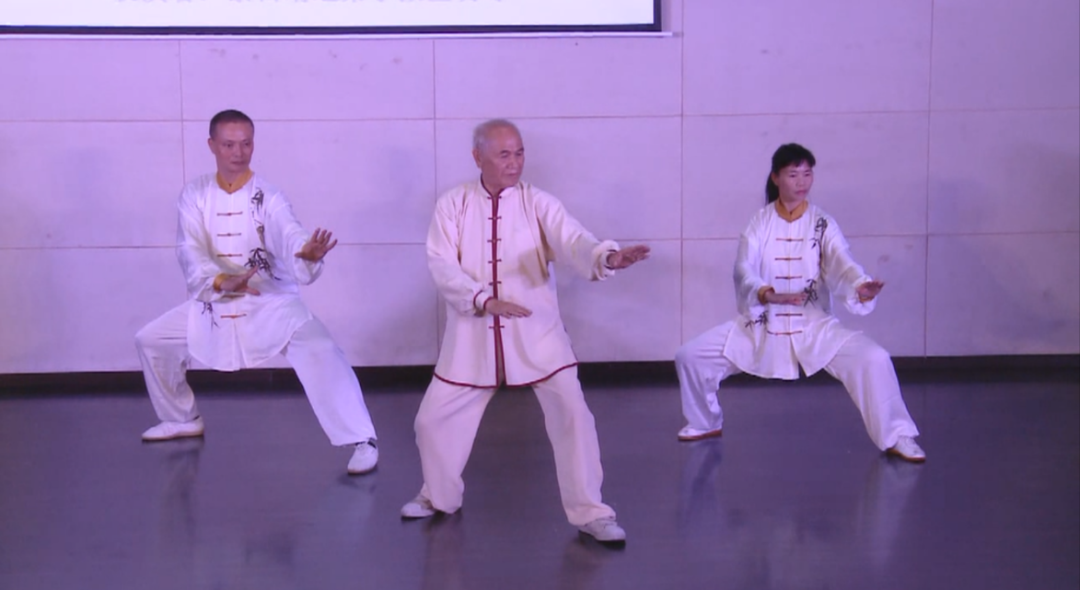 ▲2016年在佛山图书馆报告厅举办的纪念黎日晴诞辰106周年活动上张世明与弟子许凤金、何健表演王兰亭太极拳