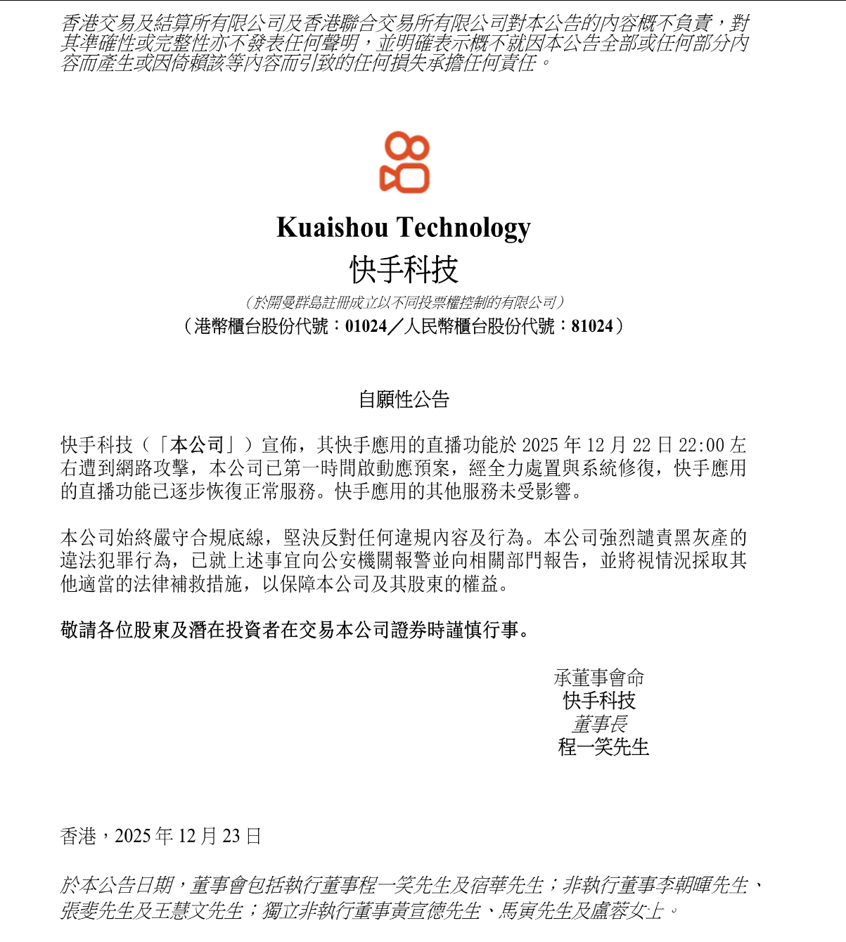 12月23日,快手发布公告称,快手的直播功能于2025年12月22日22:00左右遭到网络攻击,已第一时间启动预案,全力处置与系统修复,快手的直播功能已逐步恢复正常服务。快手应用的其他服务未受影响,“本公司始终严守合规底线,坚决反对任何违规内容及行为。本公司强烈谴责黑灰产的违法犯罪行为,已就上述事宜向公安机关报警并向相关部门报告,并将视情况采取其他适当的法律补救措施,以保障本公司及其股东的权益。”