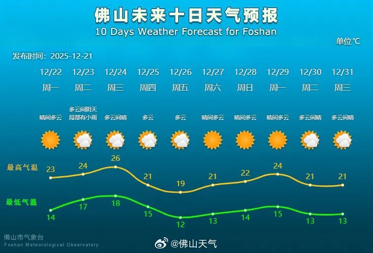 据佛山市气象台预计24日多云间晴,气温回升,25日受中等强度冷空气影响,多云间阴天,局部有小雨,气温下降,天气持续干燥,目前各区森林火险橙色预警信号正在生效,请注意森林防火和用火用电安全。