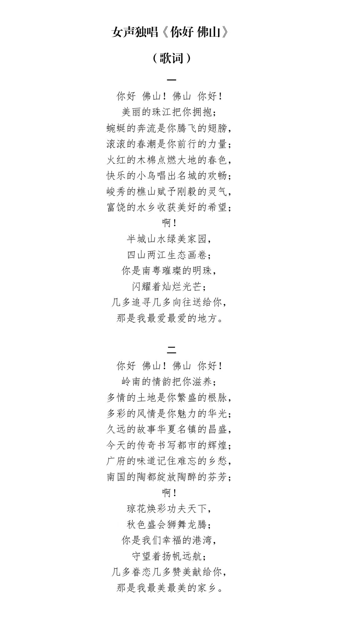 “你好佛山!佛山你好!美丽的珠江把你拥抱,蜿蜒的奔流是你腾飞的翅膀,滚滚的春潮是你前行的力量;”歌曲以珠江的情怀歌颂佛山人海纳百川、刚毅有为,敢为人先、勇立潮头的精神,“峻秀的樵山赋予刚毅的灵气,富饶的水乡收获美好的希望,”描绘了佛山人崇文务实、创新有为、兼容开放、通济和谐的精神意境。“久远的故事述说华夏名镇的昌盛,今天的传奇书写都市的辉煌;广府的味道记住难忘的乡愁,南国的陶都绽放陶醉的芬芳”,歌曲讲述佛山辉煌的历史与当代的璀璨交相辉映,盛赞佛山多彩的风情与魅力的华光,展现出现代都市的底蕴和岭南文化的源远流长。