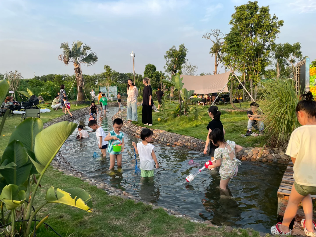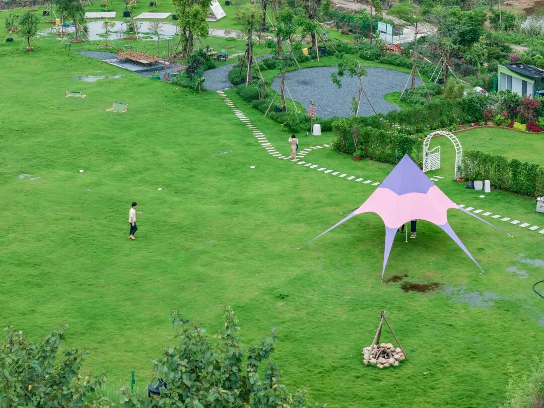 营地内小花园花开满园充满着生机,小水溪也吸引小朋友们嬉戏玩乐。而营地外是连片农田环绕,洋溢着浓厚的乡村气息,将营地设计为草坪、花园、石地、小溪以及菜园等区域:草坪可以用来露营或者举办活动、花园可以举办婚礼和年会或者小型家庭聚餐,小溪提供给小孩子游玩,菜园给孩子体验采摘。