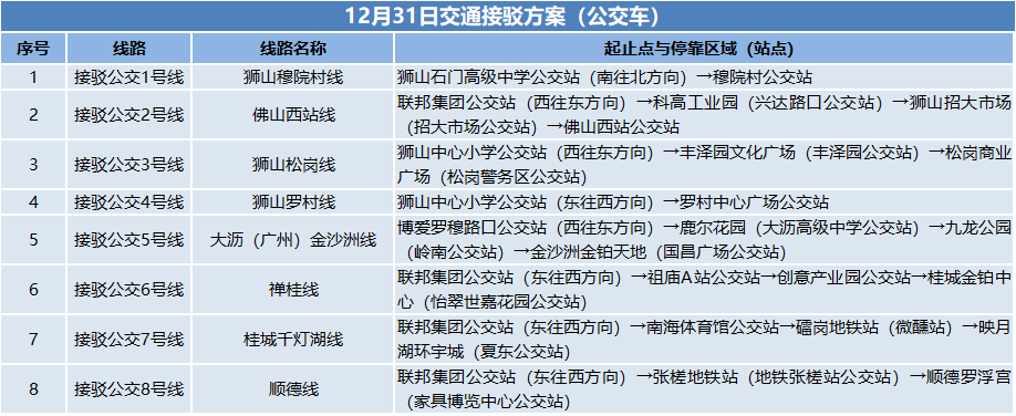 2025年12月31日至2026年1月1日,狮山开设8条免费接驳公交线路: