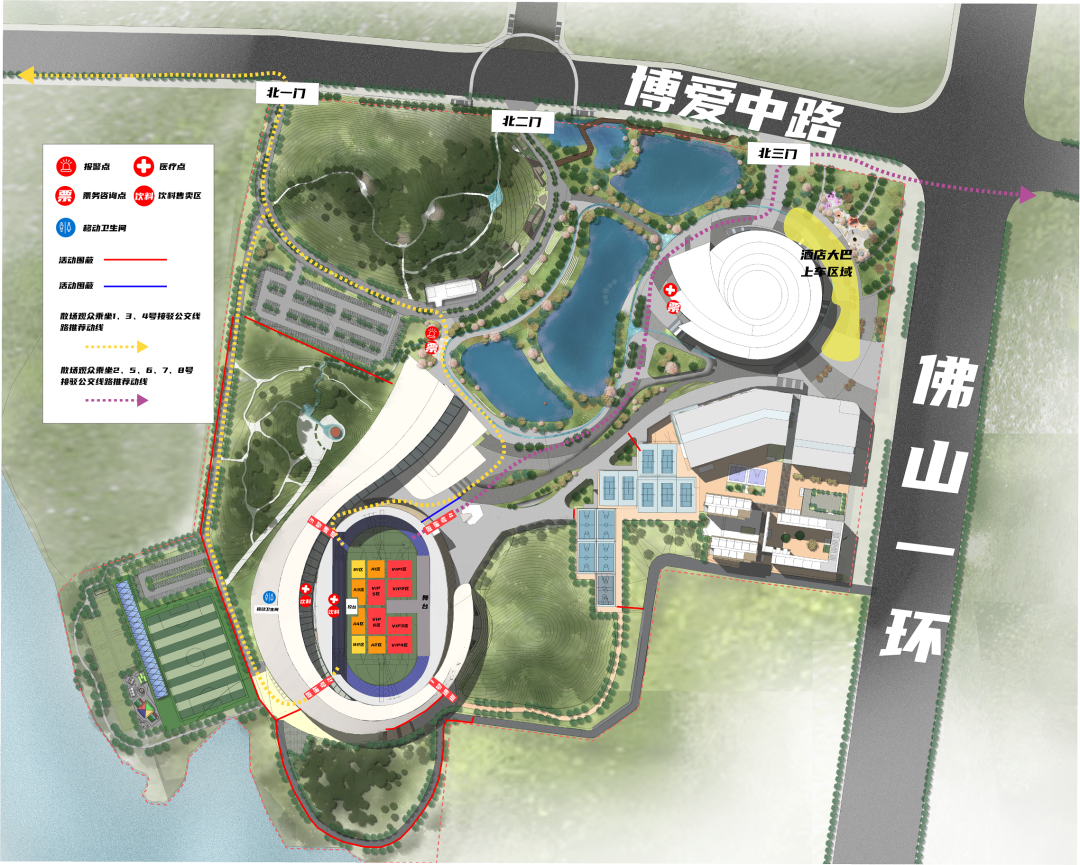 观众请从南海体育中心北二门、北三门步行进入验票区,电动自行车禁止驶入南海体育中心。