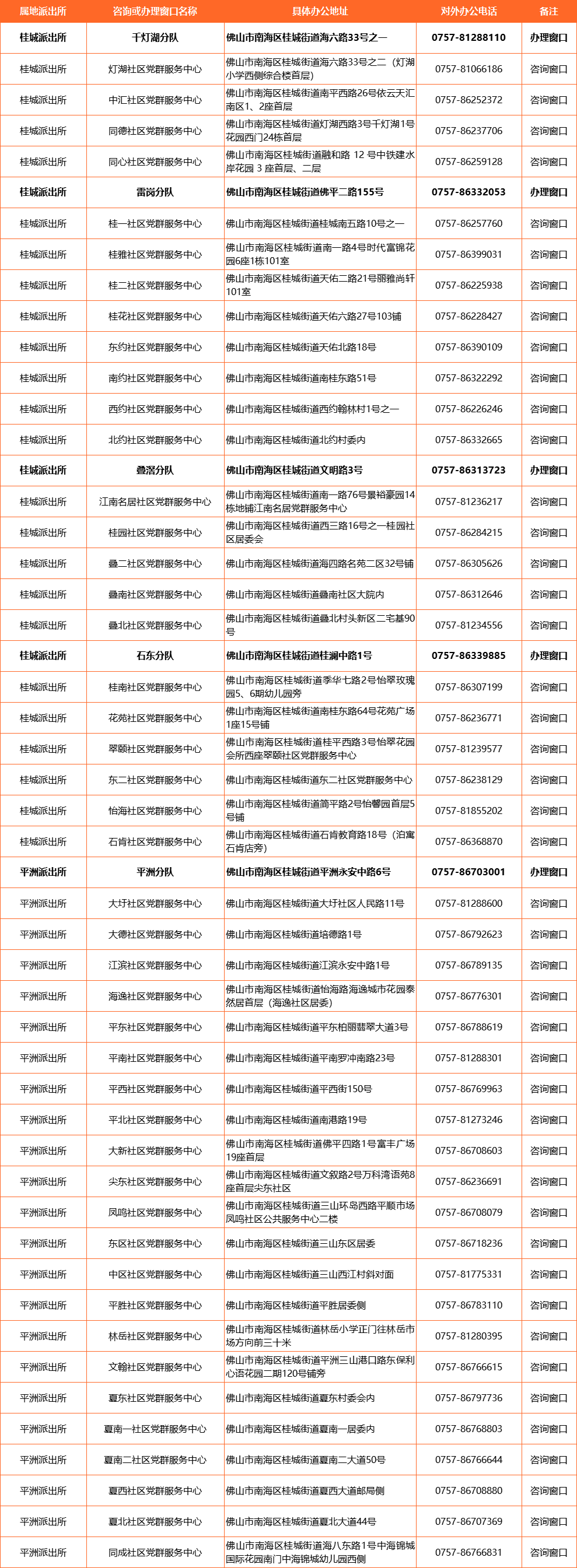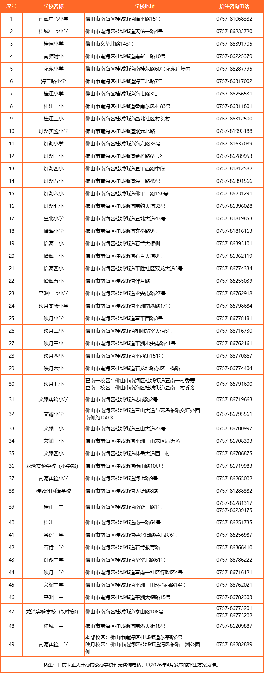 桂城大班幼儿、 六年级学生家长注意啦! 2026年义务教育公办学校 起始年级入学招生即将开始 预报名系统预计将于 2026年1月6日左右上线 一起来看看报读条件和要求吧! 2026年义务教育公办学校 起始年级入学招生预告知书 尊敬的大班幼儿家长、六年级学生家长: 您的小孩即将完成幼儿园/小学教育,2026年8月31日(含31日)前年满6周岁的小朋友将进入小学就读;六年级应届毕业生将入读初级中学。根据南海区教育局的招生时间安排,我街道公办小学和初中的新生正式报名时间预计在2026年4月(2026年1月先进行预报名)。现将2026年公办学校入学政策预告知如下: (一)户籍生是指新生户籍在桂城街道内,并在户籍所在地报名入读的适龄儿童少年。 (二)政策生是指符合《佛山市人民政府办公室关于印发〈佛山市非户籍适龄儿童少年入读公办义务教育学校实施办法〉的通知》(佛府办〔2024〕6号)规定的政策条件的适龄儿童少年(具体执行细则以街道公布的招生方案为准),由桂城街道教育部门统筹入读义务教育阶段公办学校。 (三)积分生是指不符合政策生条件,但符合积分入学申请条件,在桂城街道参与积分入学排名入围的新市民子女。(积分学位有限,建议家长做好回户籍地或到民办学校报名的准备。) 先满足户籍生,再统筹安排政策生,仍有学位剩余的再安排积分入围的积分生入读。【注:积分生的招收名额视学位情况而定。】 (一)《佛山市人民政府办公室关于印发〈佛山市非户籍适龄儿童少年入读公办义务教育学校实施办法〉的通知》(佛府办〔2024〕6号)自印发之日(2024年3月14日)起施行,有效期5年。《佛山市人民政府办公室关于修订佛山市非户籍常住人口子女入读义务教育公办学校实施办法的通知》(佛府办〔2019〕11 号)同时废止。 (二)购房80方类政策生条件已取消多年,佛山不再执行购房获得政策生待遇的政策,统一纳入积分服务体系。新修订的《佛山市新市民积分制服务管理办法》已于2023年12月由市政府办公室正式发布,自2024年1月1日起实施,有效期为5年。 四、关键材料准备 (具体报名材料以公布的 招生方案要求为准) (一)户籍生:户口簿 (二)政策生:政策生条件证明材料可参考2025年的招生方案先行准备(具体以教育部门2026年4月份公布的招生方案为准)。 (三)积分生:积分入学计分项证明材料(详见《佛山市新市民积分制服务管理办法》-佛府办〔2023〕20号)。积分入学申请条件和流程等请关注“南海桂城”微信公众号或到各社区公共服务中心积分服务窗口详细咨询了解。 注:积分入学的服务管理对象为非佛山市户籍人员(新市民),如需要申请桂城街道积分入学的新市民须持有桂城街道有效居住证。一般情况下,新市民需要在本市内实际居住并办理居住登记满半年才能申领居住证,因此居住证并非马上能领取。有办理居住证需要的家长请尽快前往现居住地所在社区党群服务中心咨询。桂城街道各社区居住证业务咨询和办理窗口的地址和电话详见下方表格: 2026年南海区小学一年级和初中一年级新生报名将继续沿用“新生入学预报名系统”,预报名系统预计将于2026年1月6日左右上线,请家长密切关注“南海教育”及“桂城教育”微信公众号,留意预报名的操作指引及最新动向。 “南海教育”微信公众号二维码 “桂城教育”微信公众号二维码 ★本次预报名主要采集户籍生和部分政策生的信息(预报名时不填报“入读学校”),主要报读类型为: 1.学生为桂城街道户籍 2.学生父母一方为桂城街道户籍 3.学生父母一方近5年连续在桂城街道办理居住证(营业执照或纳税证明),以及近5年连续在南海区缴纳社保(简称“双五类”)。 不符合上述第2类、第3类条件的其他类型政策生,可参考2025年招生方案,根据自身条件先选报“其他”类型(注意:购房类已取消,统一纳入积分服务体系),具体能否录取以2026年4月份正式报名后的审核结果为准。 提醒:以上所有预报名信息只是家长部分参考往年的招生政策初步判断的新生入学信息。请家长留意2026年4月上旬教育部门正式公布的2026年义务教育公办学校招生方案,在规定时间内办理正式报名手续。具体能否录取以正式报名后的审核结果为准。【 特别注意:预报名及正式报名均要求使用广东省内手机号码,以便及时收到报名反馈信息。】 ★积分生不属于本次预报名范围,请家长留意2026年4月份桂城街道新市民办及各社区党群服务中心积分窗口公布的积分入学报名指引。 (一)小学的入学年龄为年满6周岁的适龄儿童(2020年8月31日及之前出生)。初中入学对象为在全国学籍系统获得学籍号的小学应届毕业生。(若发现已在读小学又重新申请小学新生入学的、已在读初中又重新申请初中新生入学的,均取消录取资格。) (二)新生入学条件、招生地段(片区)的划分、报名时需提交的材料、报名时间、地点等具体信息以教育部门公布的招生方案为准。请家长于2026年4月上旬留意以下网站的公布。 查询网站:“佛山市南海区人民政府网” 查询网址:http://www.nanhai.gov.cn 查询路径:首页>部门导航>镇街>桂城街道办事处>信息公开目录>通知公告 (三)不符合前述入读条件的家长,应及早密切留意民办学校或新生户籍地的招生安排,因报读条件不符造成延误或错过报名时间的,责任自负。 (四)公办学校非起始年级插班转学须在学校有学位的情况下才能办理