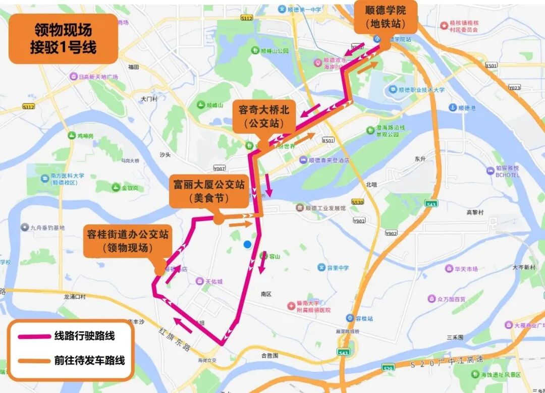 顺德学院地铁站→容奇大桥北公交站→容桂街道办公交站→富丽大厦公交站(顺德美食嘉年华)→容奇大桥北公交站→顺德学院地铁站
