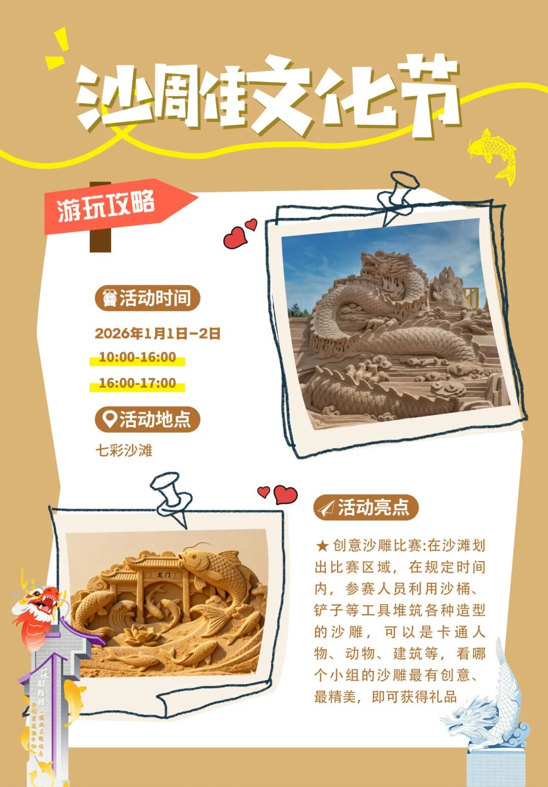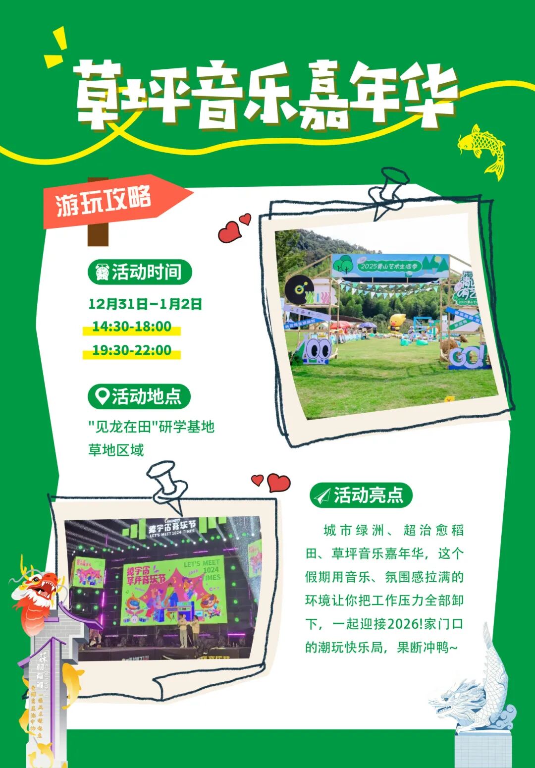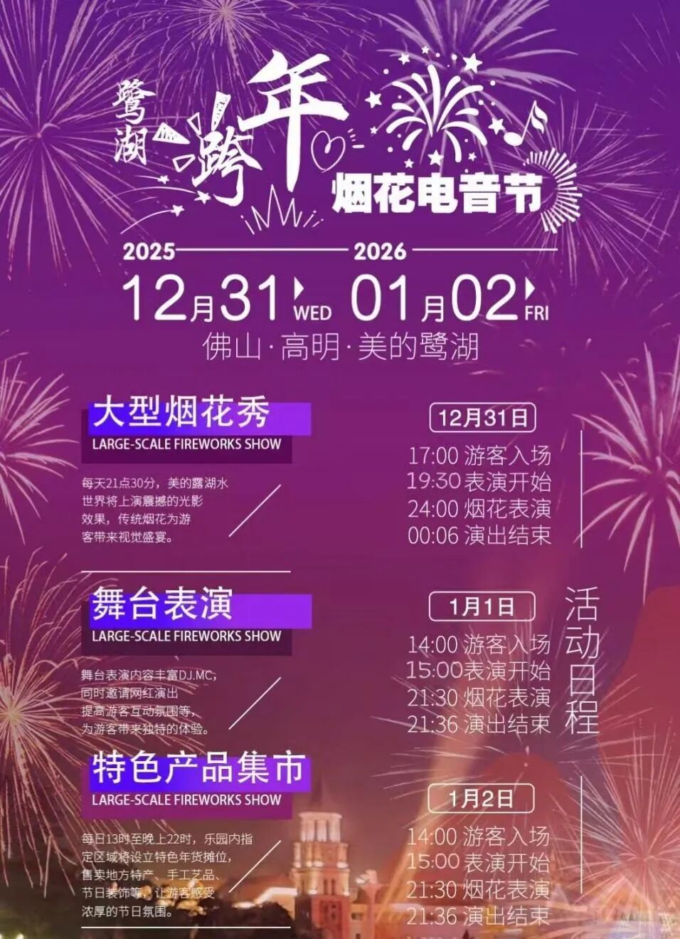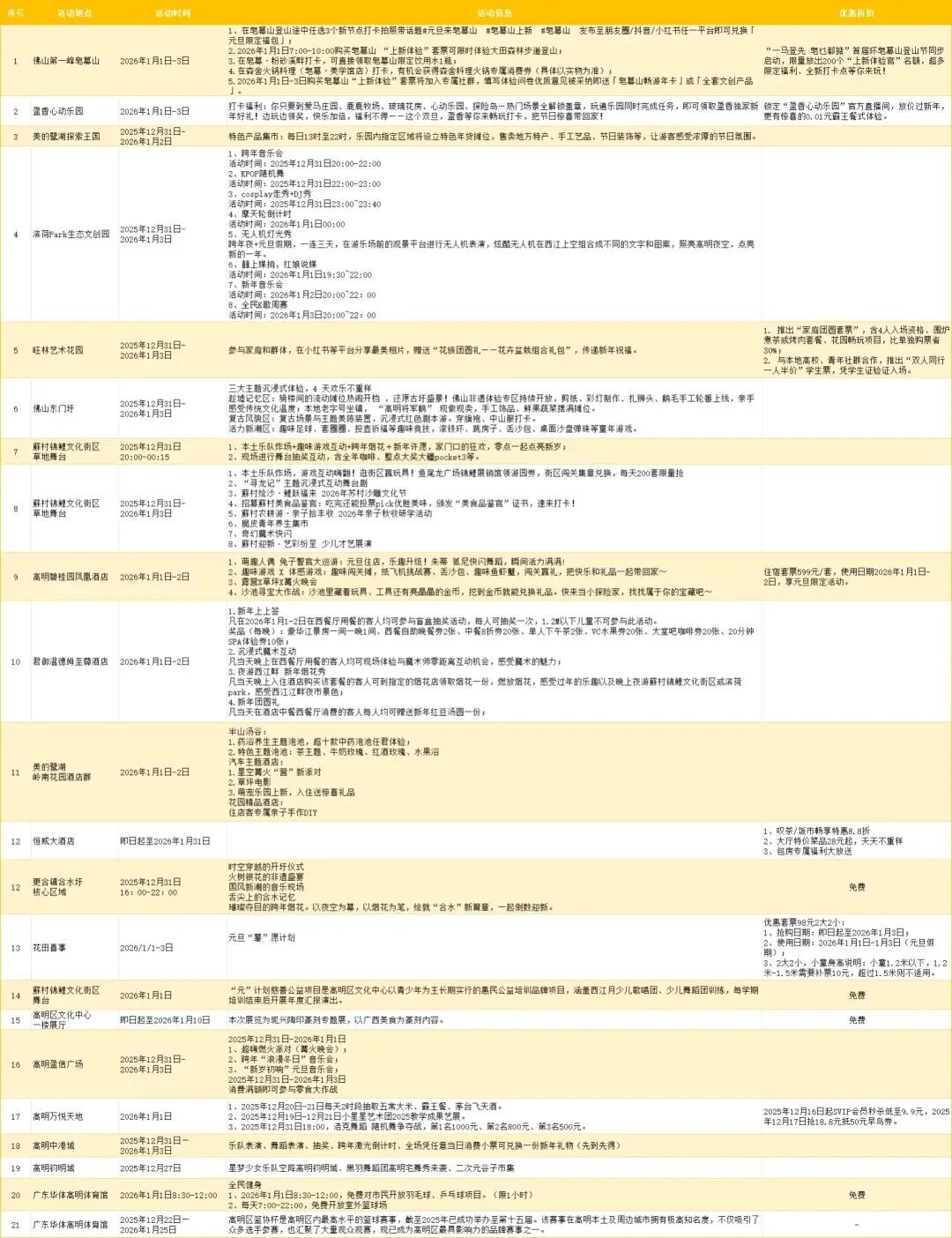 高明区2026年元旦假期活动来啦 梦幻飘雪、烟花秀 无人机灯光秀等精彩活动将接连登场 承包你一整个假期的热闹与快乐 快收藏起来吧~ 盈香心动乐园 亮点一:梦幻飘雪 2026年1月1日-3日,每日定时梦幻飘雪活动、小鹿快闪活动,沉浸感拉满!假期期间,景区还有《冰雪女王》剧场上演,“飘雪”从天而降,带你走进剧场里的冒险之旅~ 亮点二:无痛登顶 骑上“小鹿”上山,无痛登上凌云山顶;在2000米粉色赛道上疾驰,风声在耳边为新一年喝彩;接着再挑战1800米玻璃滑道,刺激与浪漫一次性打包带走! 图源:盈香生态乐园 亮点三:矮马家族送祝福 亲和力满分的“小矮马家族”,在景区为大家送上新年好运,欢迎来摸摸它柔软的鬃毛,咔嚓一下拍张合影哦~景区内还有卡皮巴拉、梅花鹿、边牧、小山羊等一众小动物。来一趟,马上带走一整年的柔软好心情~ 图源:盈香生态乐园 美的鹭湖森林度假区 亮点一:大型烟花秀: 2025年12月31日-2026年1月2日,每天21点30分,鹭湖探索王国的水世界将上演震撼的光影效果,七彩祥云与传统烟花为游客带来视觉盛宴。 亮点二:特色集市+舞台表演 每日13时至22时,探索王国乐园内指定区域将设立特色年货摊位;现场还有精彩演出,带来热闹的气氛。 佛山东门圩 复古圩市、烟花汇演、摩登风街景、非遗体验、童年游戏全程在线,萌系 IP “高小鹅” 陪伴你从岁末嗨玩到年初,解锁新年第一份热闹与惊喜。 12月31日当晚: 活动19:45开始,流行乐队、说唱、魔术、生活主题小品轮番炸场;烟花秀21:35准点绽放,告别2025,迎接2026! ↓活动时间表↓ 2026年1月1日-3日(全天): 三大主题体验区、美食摊位、互动游戏全程开放,更有摄影摄像、云直播、AI 打卡服务,记录欢乐瞬间,沉浸式感受趁墟乐趣。 滨荷Park生态文创园 亮点一:音乐会+KPOP随机舞+cosplay走秀+DJ秀 时间:2025年12月31日20:00-23:40 图源:滨荷Park生态文创园 亮点二:“高明之眼”摩天轮倒计时 时间:2026年1月1日00:00 图源:滨荷Park生态文创园 亮点三:元旦假期,无人机灯光秀 第一场:1月1日00:00-00:15 第二场:1月1日21:00-21:15 第三场:1月2日21:00-21:15 旺林艺术花园 亮点一:雪景花园拍照打卡 通过精妙的植物配置与艺术设计,打造了浪漫的景观。无论是家庭出游记录温馨时刻,还是摄影爱好者追逐光影,这都是绝佳的出片胜地,让你在朋友圈收获满满点赞。 图源:高明旺林艺术花园 亮点二:露营篝火晚会 当夜幕降临,你可以在露营基地享受围炉煮茶的闲适,或参与热闹的露营烤肉派对,让滋滋作响的烤肉声和弥漫的香气唤醒最原始的快乐。 亮点三:烟花秀 以深邃的夜空为幕布,旺林艺术花园的烟花秀将为你献上一场璀璨夺目的光影盛宴。这场烟花秀不仅是视觉的享受,更是情感的升华,象征着对旧岁的告别与新年的憧憬。 “佛山第一峰”皂幕山 一马登先,皂乜都掂!目前,皂幕山山体正在临时闭园升级中详情,即将以全新面貌,在元旦假期与大家见面! 赖志华摄 皂幕山元旦假期登山攻略,提前告诉你! 1、在皂幕山登山途中任选3个新节点打卡拍照带话题#元旦来皂幕山#皂幕山上新#皂幕山 发布至朋友圈/抖音/小红书任一平台即可兑换「元旦限定福包」; 2、2026年1月1日7:00-10:00,购买皂幕山“上新体验”套票可限时体验大田森林步道登山。 蘇村锦鲤文化街区 亮点一:看烟花秀,抽奖品 街区将上演两场烟花秀,其中第一场是12月31日晚上8点半,最佳观赏地点在鱼尾龙广场;第二场是1月1日零点,最佳观赏点在见龙在田研学基地。还有本土乐队强势炸场,用音浪点燃夜晚。 亮点二:草坪音乐嘉年华 从午后到晚上多支特色乐队轮番登台,涵盖流行、独立、民谣、轻摇滚等多种风格,让你在草地上随音浪自由摇摆~ 亮点三:沙滩狂欢 · 亲子与极限共舞 免费观赏奇幻沙雕群,打卡红火一整年。还可以全家上阵,用提供的工具堆砌属于你们的“锦鲤”。 还有水上极限特技秀、田园亲子嘉年华、养生潮流研究所等精彩活动等你来参与。 更合镇合水圩 活动时间:12月31日16:00-22:00 亮点一:“打铁花”与烟花龙、荧光狮共舞,寓意红红火火; 图源:更合发布 亮点二:国风新潮的音乐现场,让传统民乐“潮”起来;还有神秘变脸绝活、高难顶碗挑战等杂技团队倾情演艺。 亮点三:舌尖上的合水记忆,汇聚本地特色小吃与网红美食,让你来了就“吃不完、逛不够”; 亮点四:烟花绽放,以夜空为幕,以烟花为笔,绘就“合水”新篇章。 更多精彩活动见下图 ↓↓↓