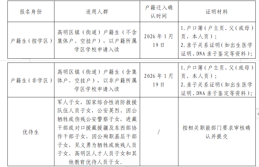 本次插班生报名对象分为户籍生(按学区)、户籍生(非学区)和优待生,且未取得高明区公办中小学学籍的学生。网上报名时仅能选择一种报名对象填报。跨年级插班生、已取得高明区公办中小学学籍或学籍处于休学状态的的插班生均不符合插班生报名对象条件。具体分类和证明材料如下: