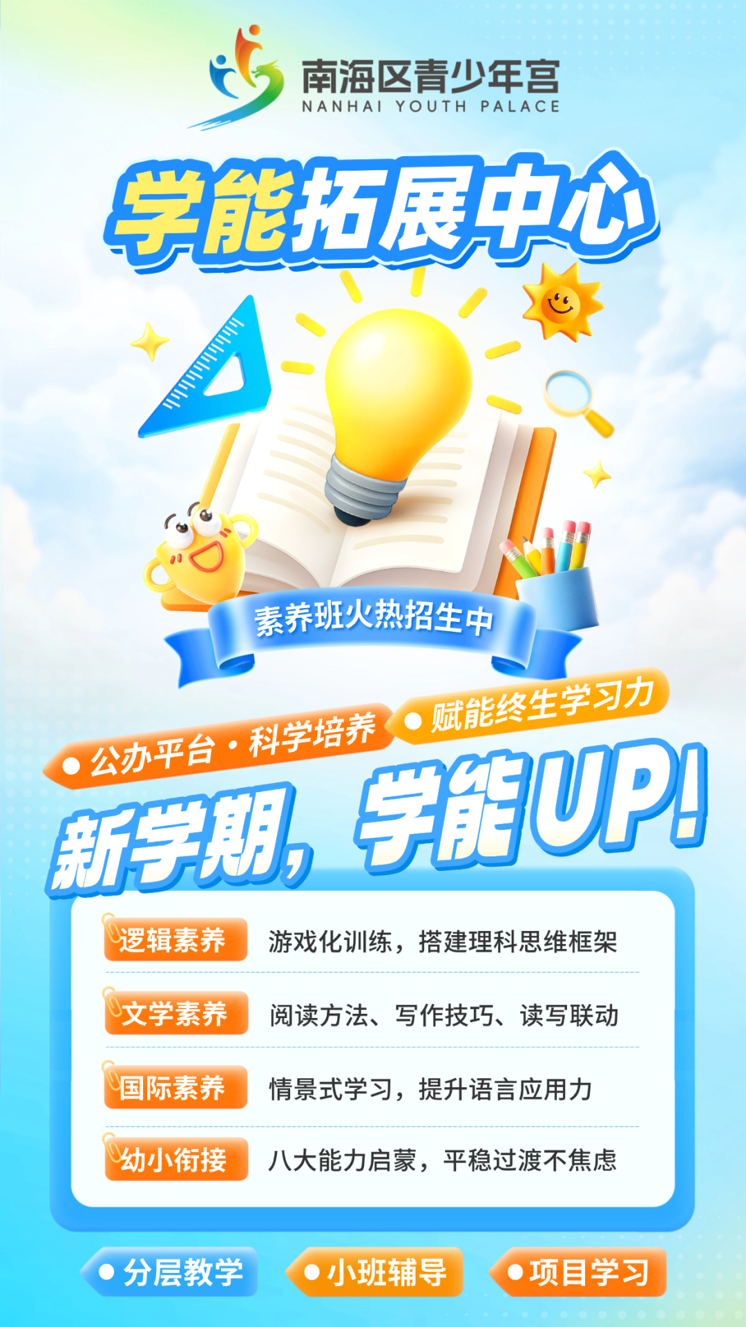 新设学能拓展中心板块,开设逻辑素养、数理思维、文学素养、国际素养、幼小衔接等课程,帮助学员打牢素养基础,拓展思维能力,学习能力和艺术素养同步进行,一站式服务,家长不用东奔西跑。