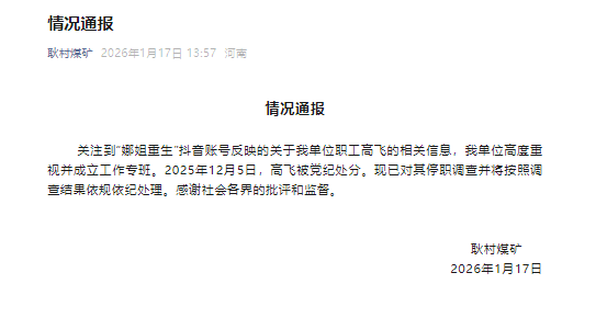 关注到“娜姐重生”抖音账号反映的关于我单位职工高飞的相关信息,我单位高度重视并成立工作专班。2025年12月5日,高飞被党纪处分。现已对其停职调查并将按照调查结果依规依纪处理。感谢社会各界的批评和监督。