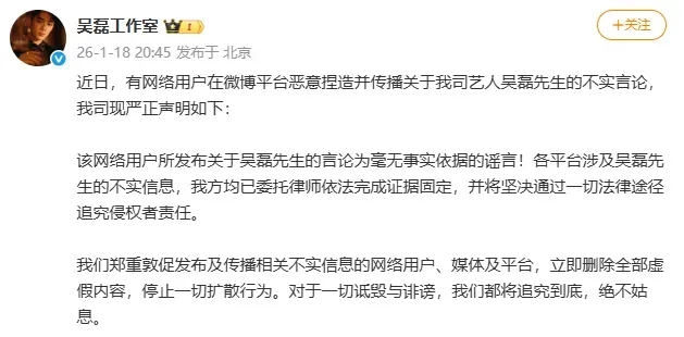 该网络用户所发布关于吴磊先生的言论为毫无事实依据的谣言!各平台涉及吴磊先生的不实信息,我方均已委托律师依法完成证据固定,并将坚决通过一切法律途径追究侵权者责任。