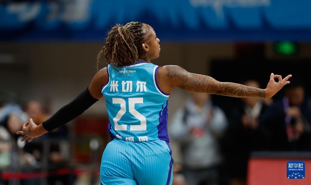 1月20日,北京首钢园队球员蒂芙尼·米切尔在比赛中庆祝自己的三分球。