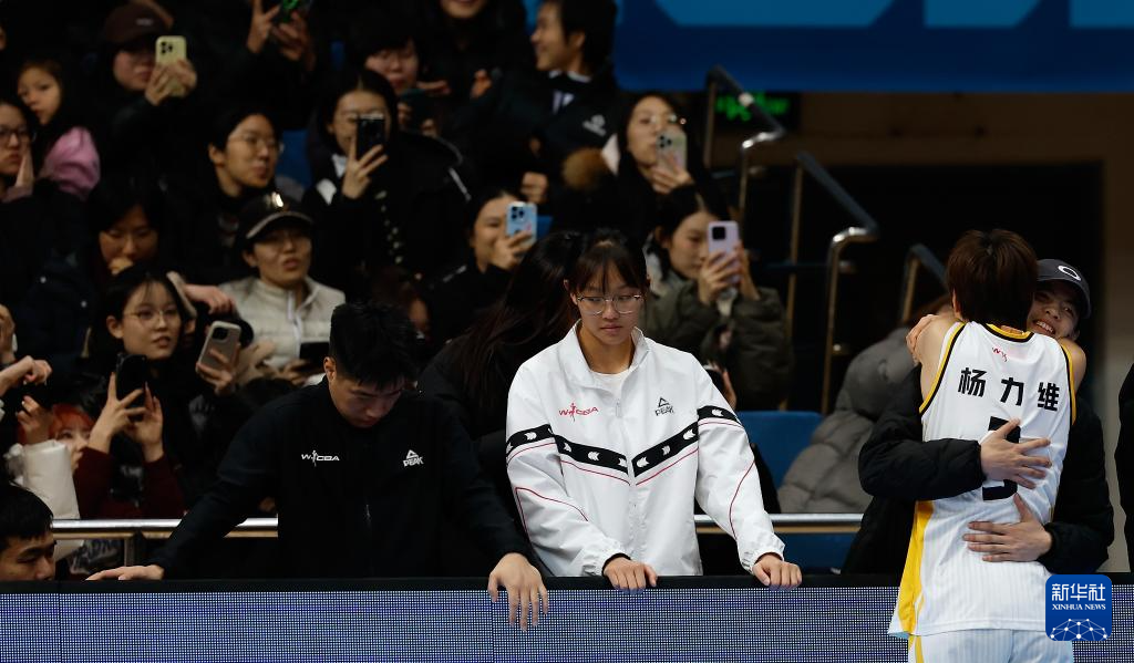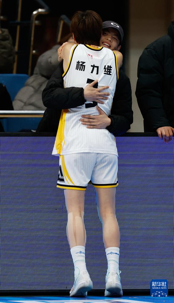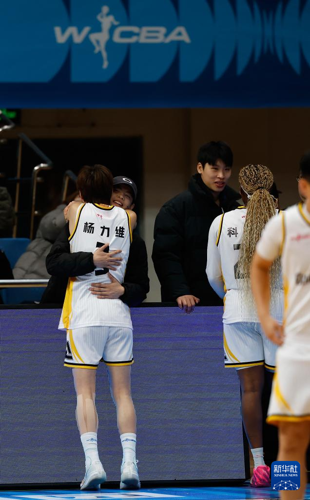 1月20日,参加女篮国家队集训的广东东莞新彤盛队球员杨舒予(右后)在开赛前与姐姐杨力维拥抱。
