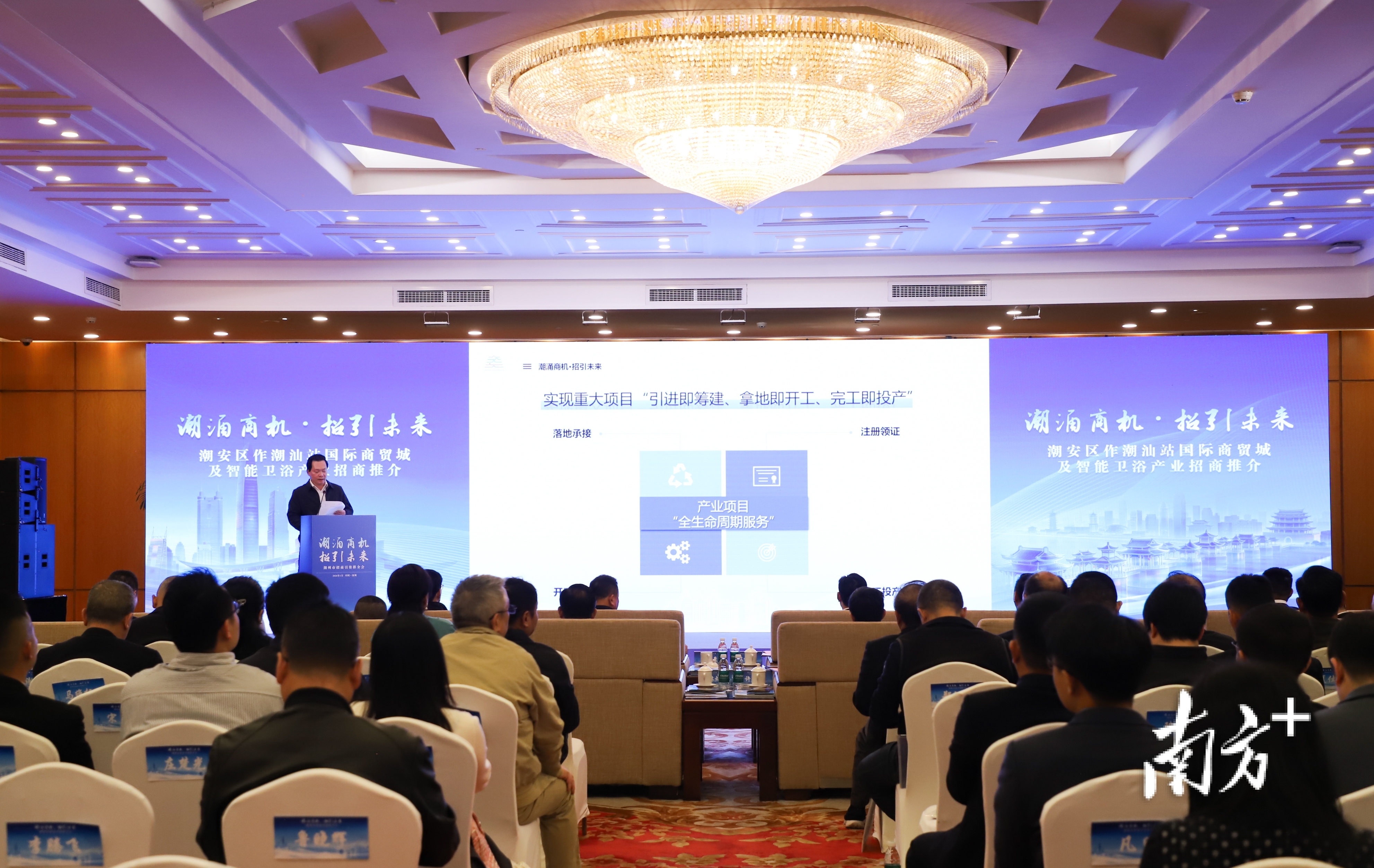 推介会上,潮安区作潮汕站国际商贸城及智能卫浴产业推介,潮州港经济开发区介绍新材料产业园及临港产业园,湘桥区推介现代食品产业园区及商贸产业,潮州市文化广电旅游体育局作文旅酒店专题推介,潮州市城建投集团则介绍产城融合优质项目。