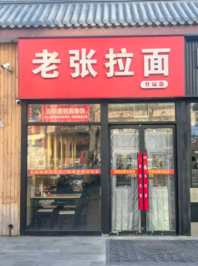 那碗热面,让成奶仓记了很久。这份温暖,也成为他日后开店的初心。2018年,成奶仓在工体附近开了第一家老张拉面馆,遇到有困难的人免费提供一碗热腾腾的拉面成了店里不成文的规矩。2023年,他在日坛北门开第二家店时,免费吃饭的提示仍然雷打不动地贴在门口的玻璃上。
