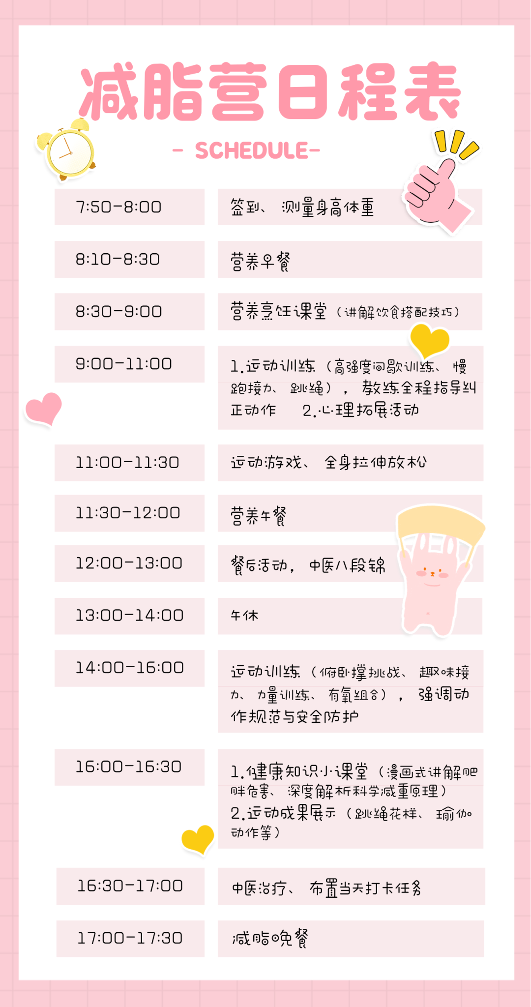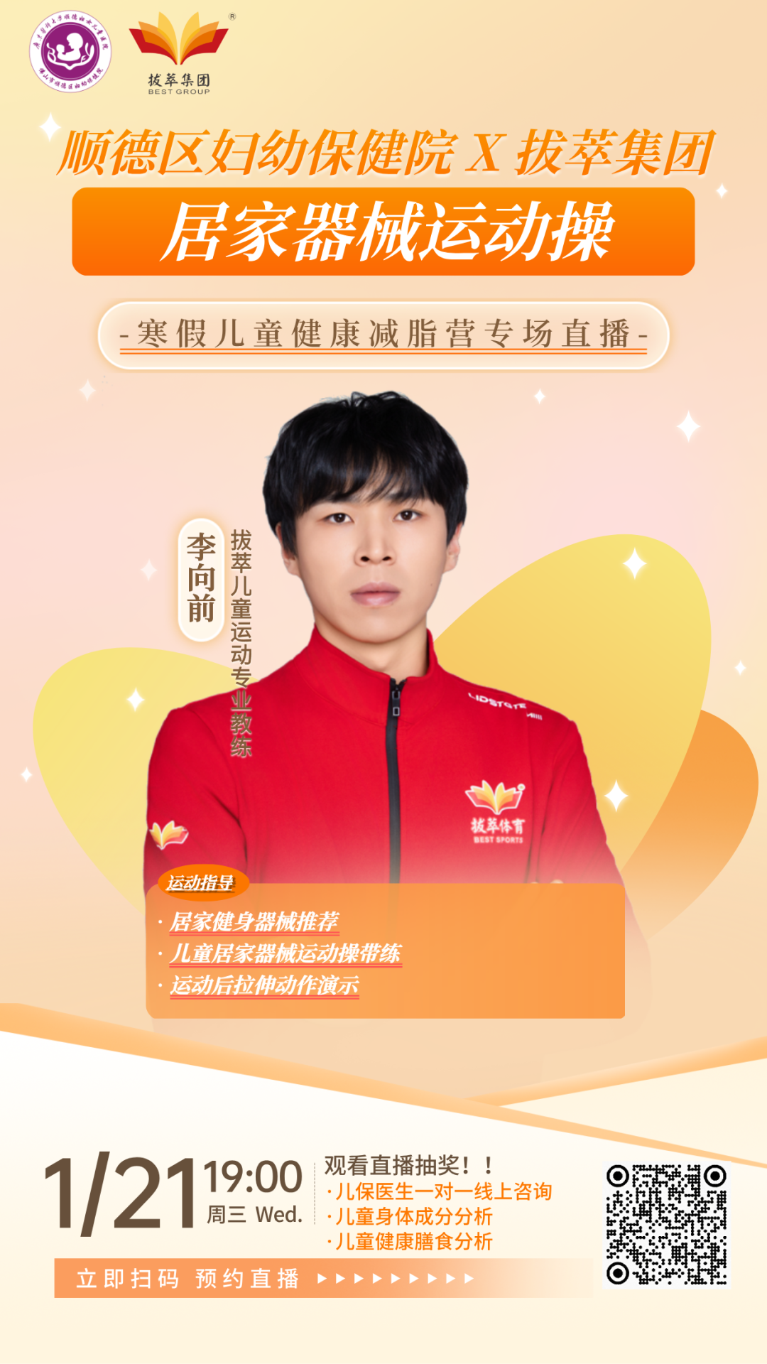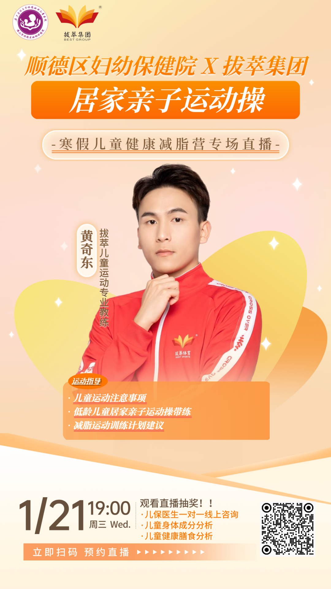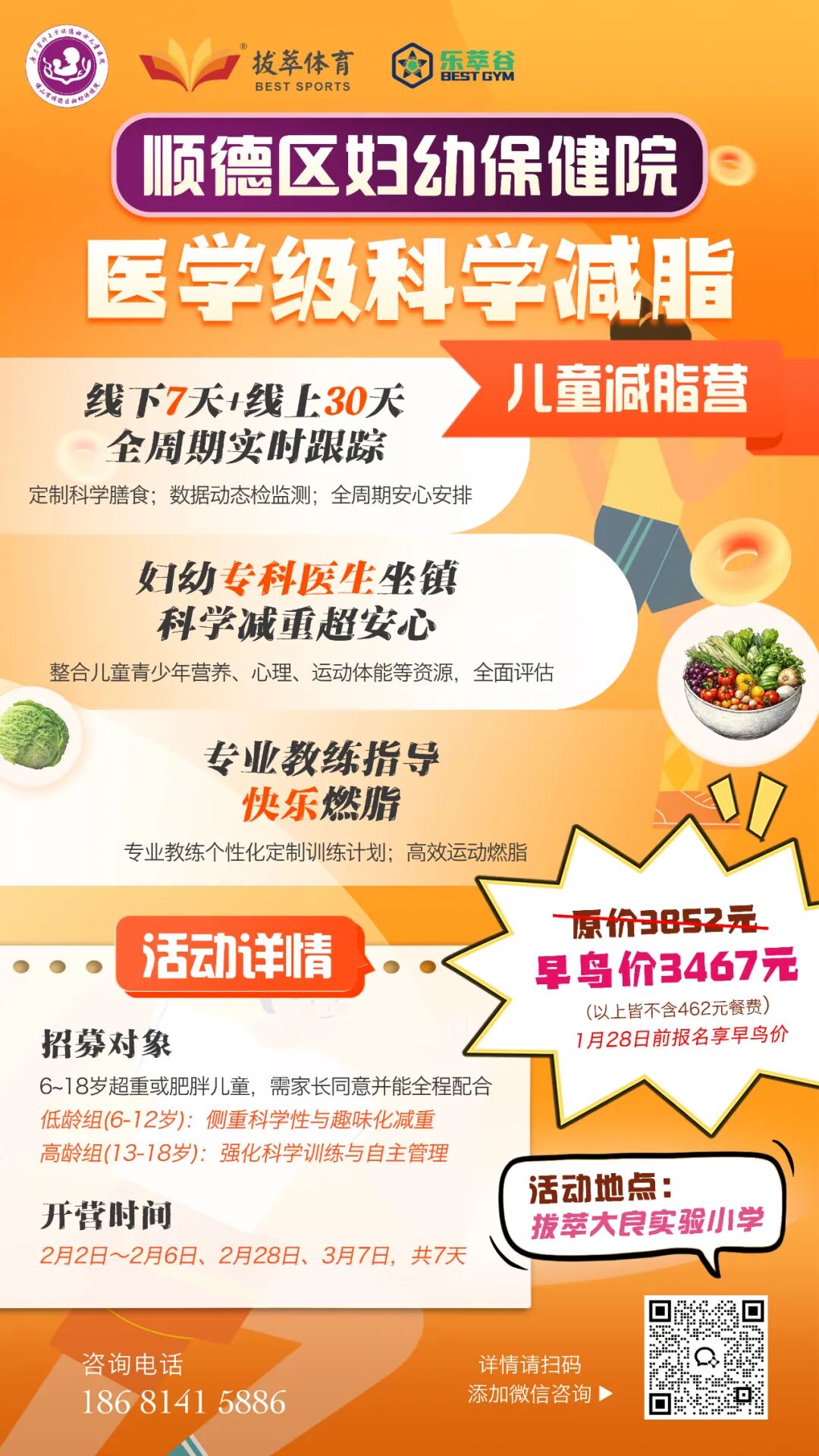 每周1次医生+营养师+教练联合直播答疑;每两周1次一对一视频回访,针对性调整方案;结营后6个月,每2个月专人回访,跟踪体重变化; 定时发健康知识、分龄运动方案、减脂餐食谱,鼓励全家参与,互相交流经验; 第二期寒假减脂营正在招募中 添加儿童保健科健康管家咨询
