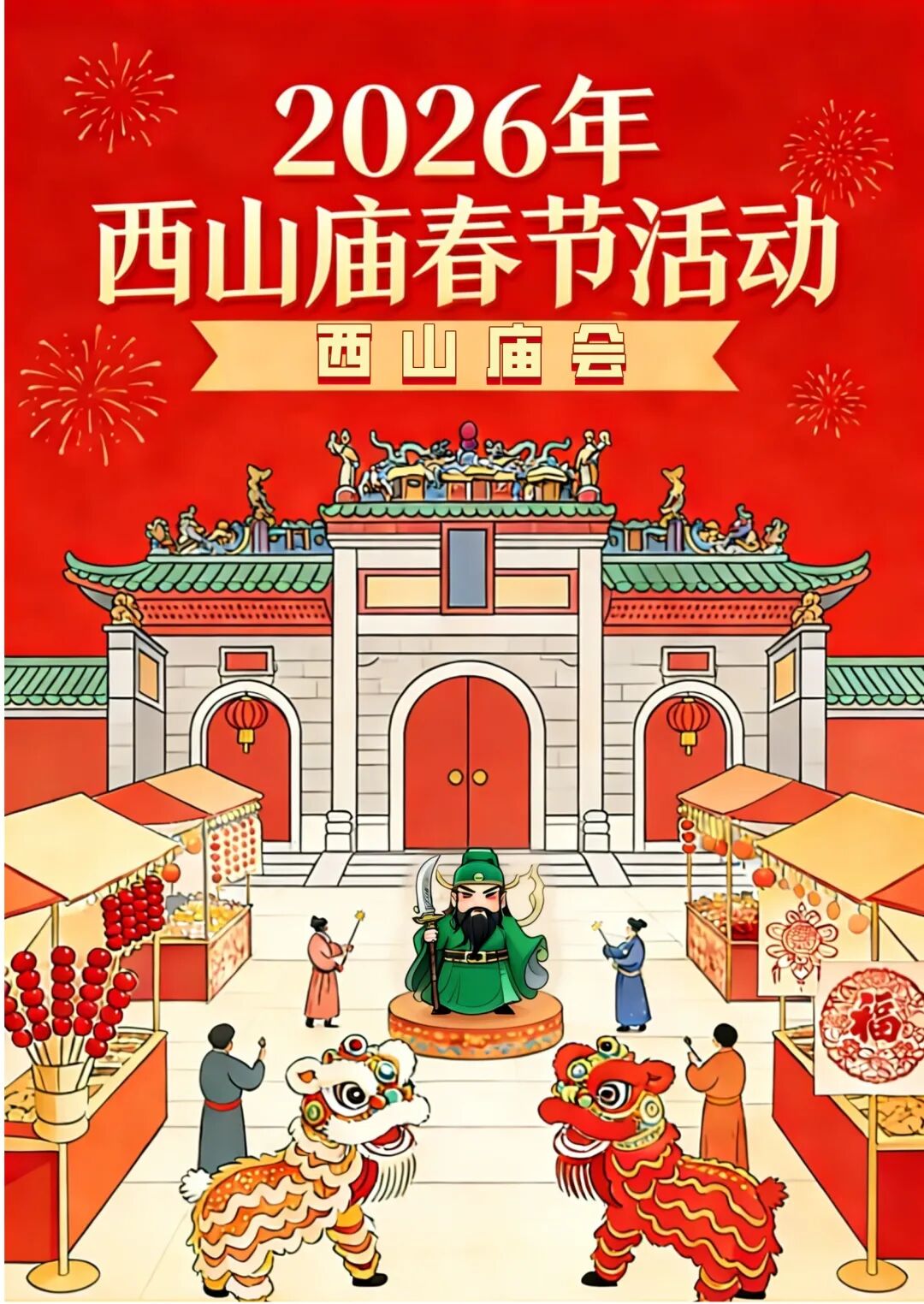 除夕晚11点至年初一凌晨2点民俗活动,新年祈福;大年初一至大年初三西山庙广场新春庙会活动,醒狮贺岁,财神互动。