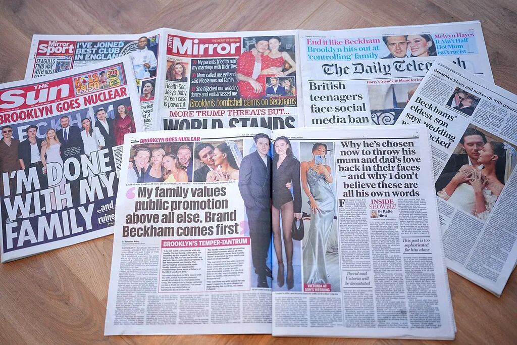 当地时间2026年1月20日,英国多家报纸头版刊登了关于贝克汉姆家族不和的报道。图/视觉中国