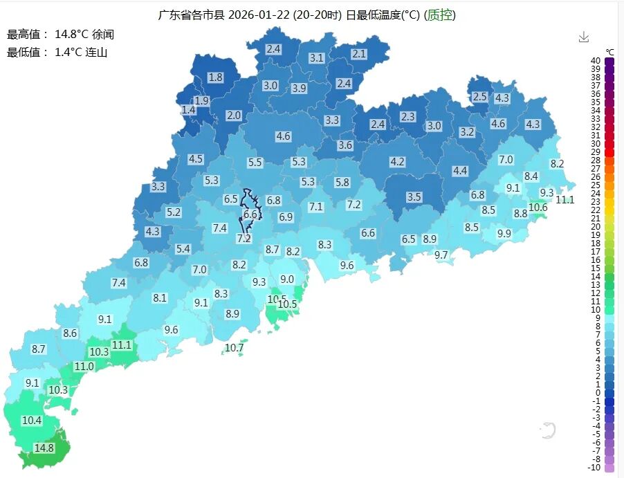 受较强冷空气影响,1月20日至22日佛山北风加大,气温逐日下降。22日早晨全市最低气温降至6.6℃,为本轮冷空气过程最低气温;当日白天云被沉重,阳光隐匿,气温无力回升,市内大部最高气温仍徘徊在10℃以下。