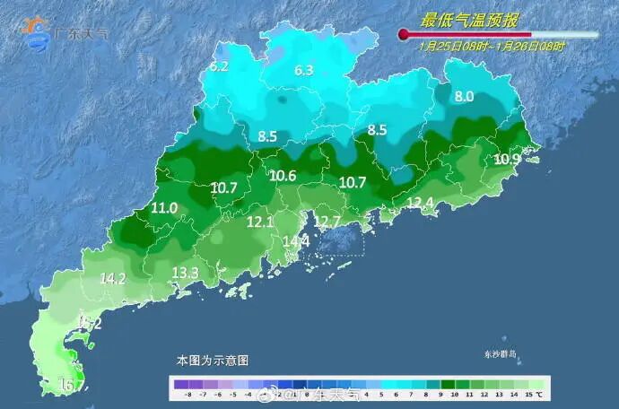 24日,珠江三角洲南部和粤东市县晴到多云,夜间转阴天,有分散性零星小雨,其余市县晴到多云。大部市县早晚有轻雾,局部地区有雾。最低气温:粤北偏北市县2~5℃,局部有霜冻,粤北偏南市县、珠江三角洲北部和东部市县、粤东的北部市县5~8℃,雷州半岛市县12~16℃,其余市县8~12℃。
