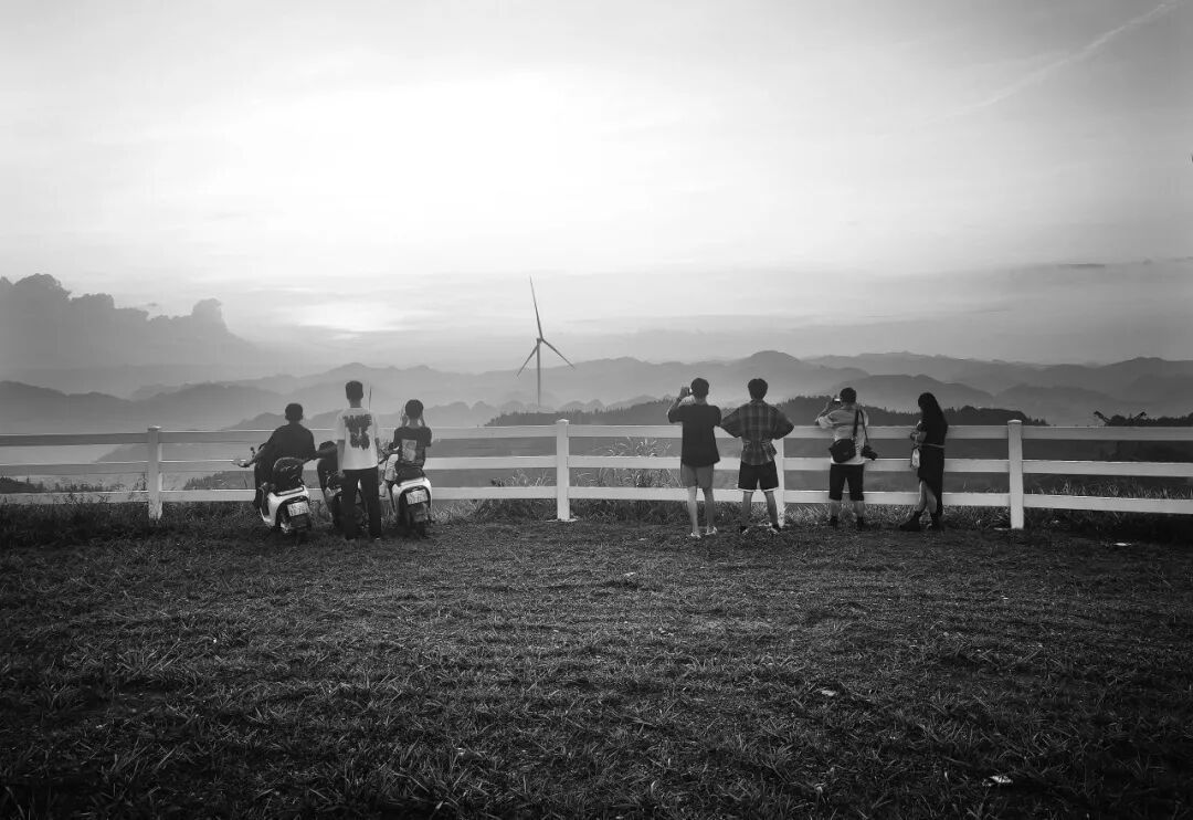 ▲羊加山上,晚霞与风力发电机相映成趣,吸引了年轻人拍照“打卡”。2024年8月15日,那坡县城厢镇