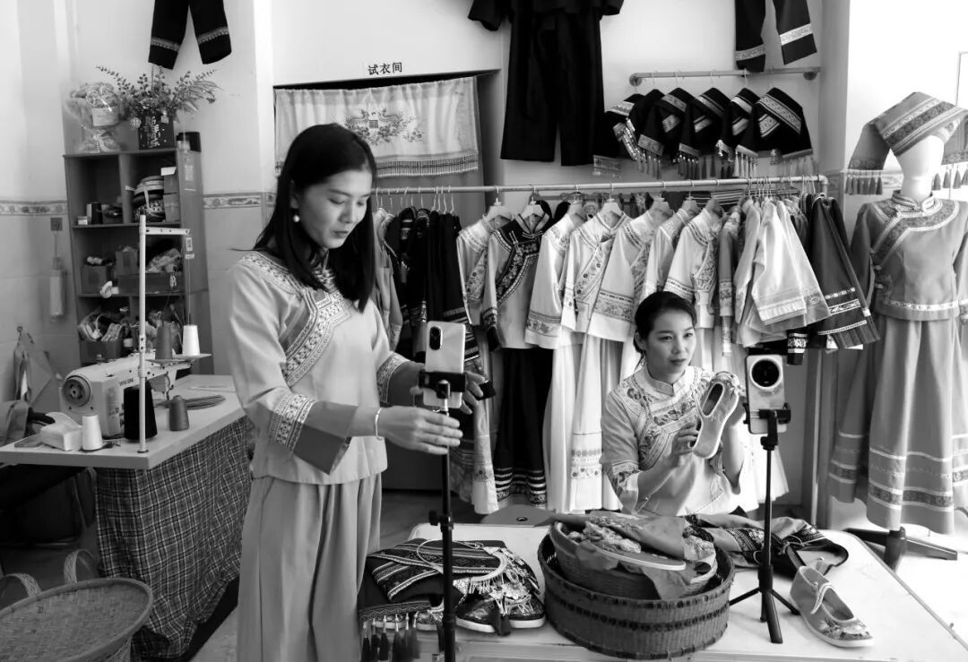 ▲电商模式为年轻人提供了全新的职业选择,壮族青年李雅媛和韦春曲正在进行直播带货。2025年4月15日,那坡县城厢镇