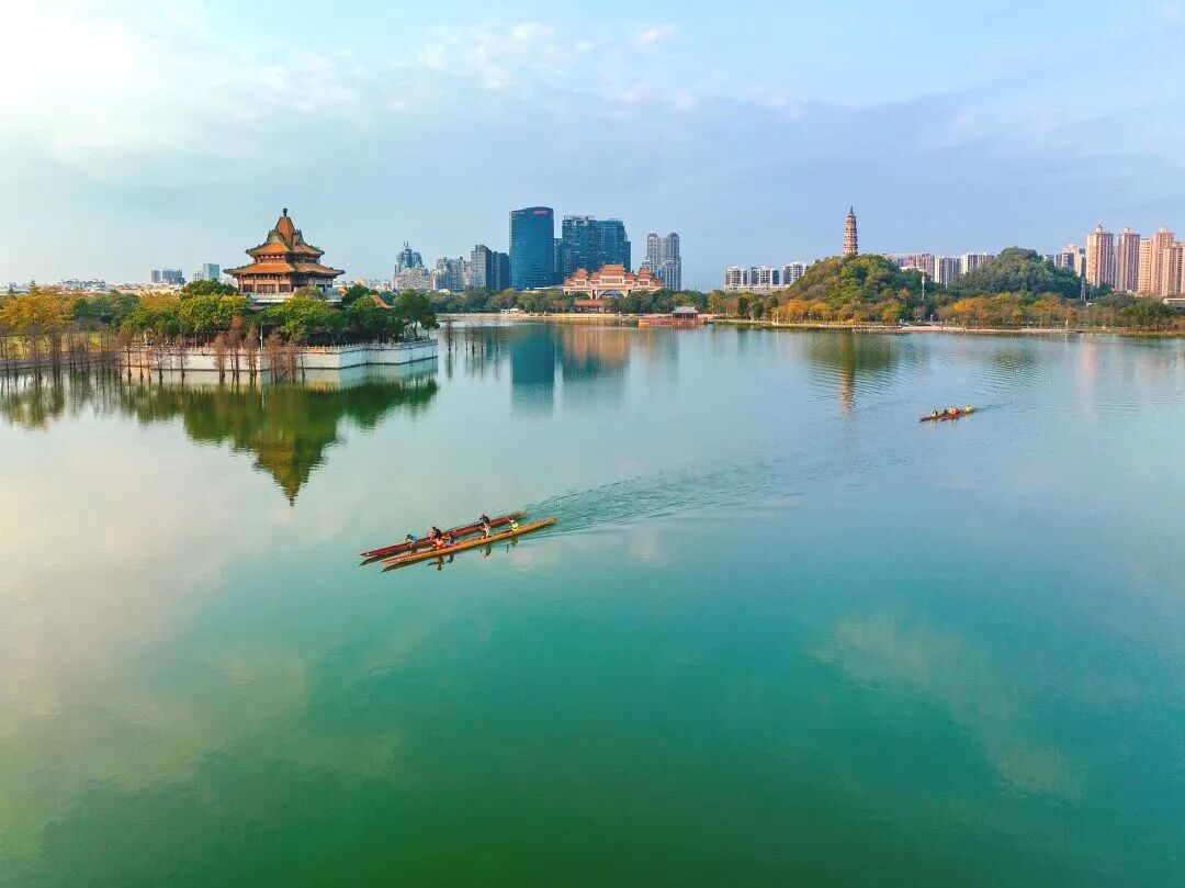 顺峰山公园的晨光湖景,是不可错过的顺德美景。青云湖水面面积653.6亩,湖畔绿树环绕,与巍峨的中华第一牌坊、雅致的青云塔相映成趣,亭台楼阁、石桥回廊点缀其间,尽显岭南园林的温婉韵味。