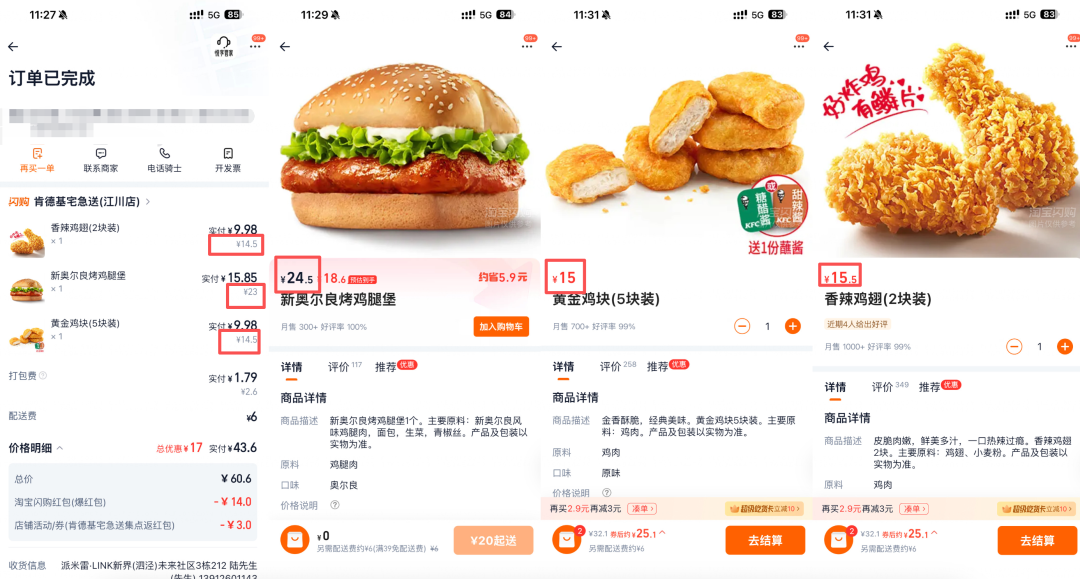 具体价格方面,蓝鲸记者查询发现,吮指原味鸡(一块装)原价14.5元,现价15.5元,涨价1元;劲爆鸡米花(小)原价14.5元,现价15.5元,涨价1元;新奥尔良烤鸡腿堡原价23元,现价24.5元,涨价1.5元;香辣鸡翅(2块装)原价14.5元,现价15.5元,涨价1;黄金鸡块(5块装)原价14.5元,现价15元,涨价0.5元。