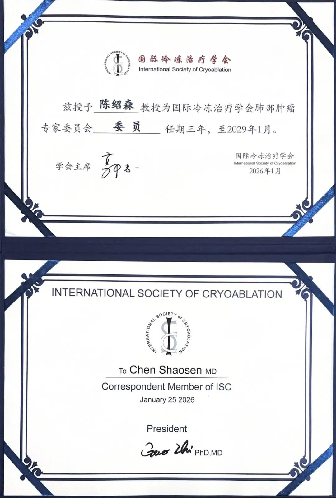 陈绍森主任当选为国际冷冻治疗学会肺部肿瘤专家委员会委员