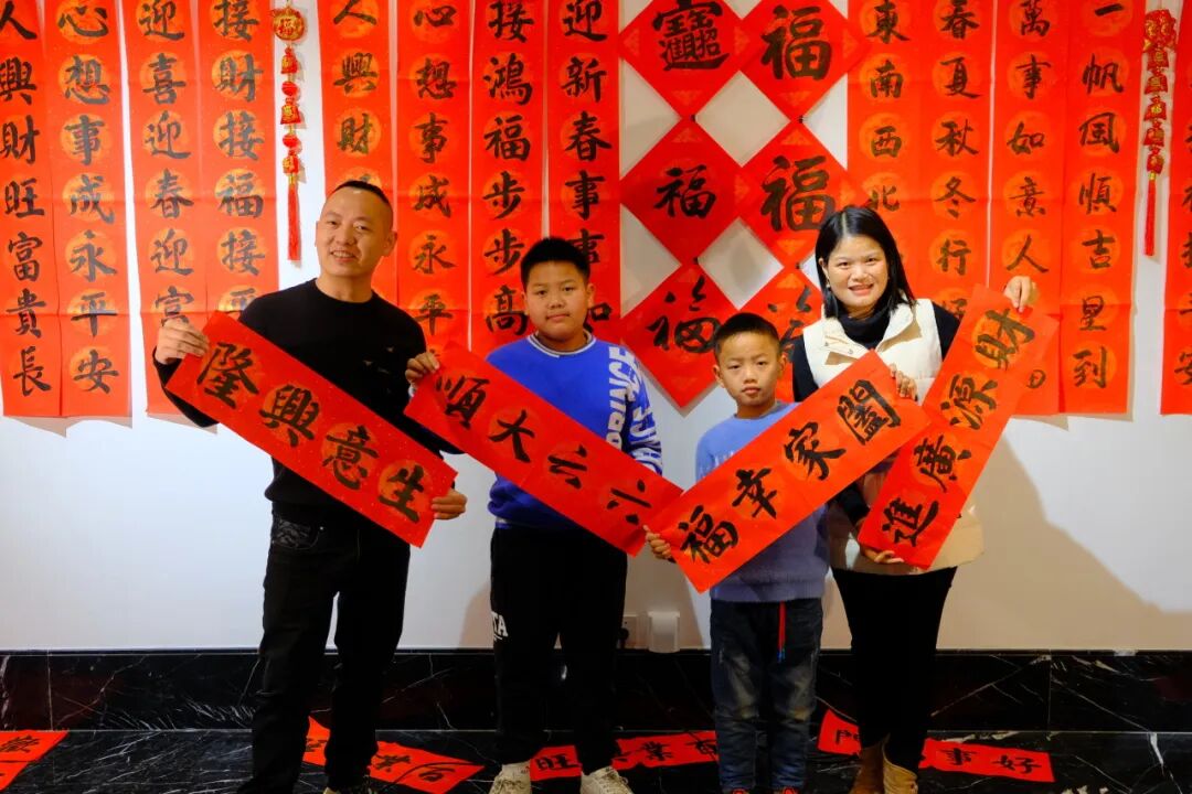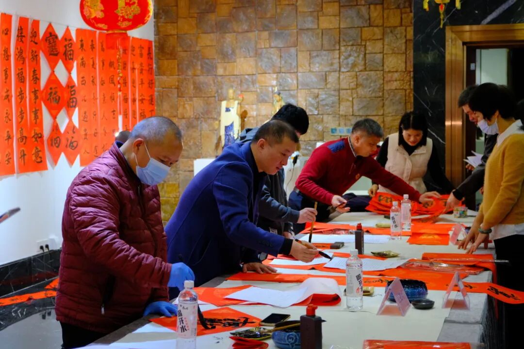 特邀书法老师现场挥毫,红纸金墨与黑墨,一笔一划书写吉祥祝愿。